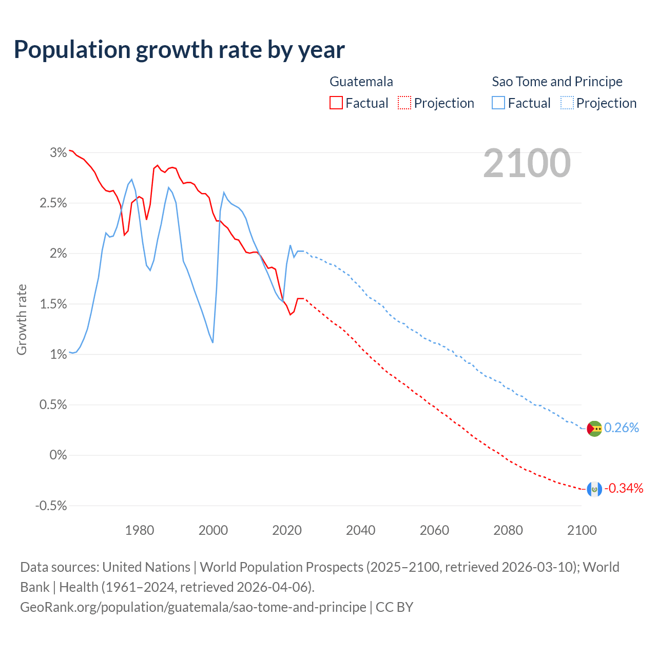 - For the last 10 years, Guatemala has had an average growth rate of +1.64% per year vs +1.82% in Sao Tome and Principe.
