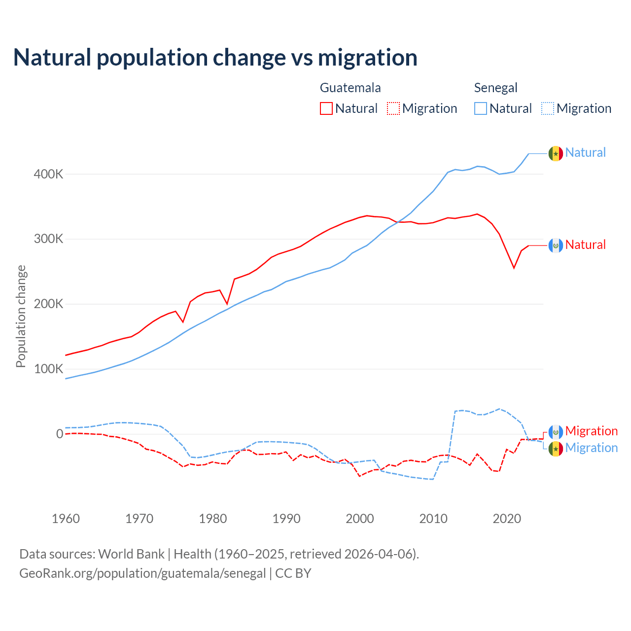 Over the last 10 years, 89.8% of the population change in Guatemala is from natural causes (a gain of 3,077,847 people) and 10.2% is from migration (a loss of 347,818 people). In Senegal 93.9% is from natural causes (a gain of 4,089,205 people) and 6.13% is from migration (a gain of 267,266 people).