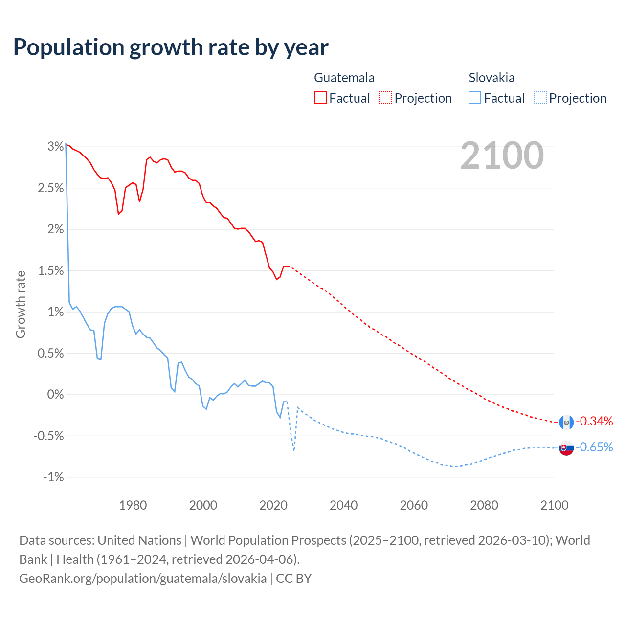 - For the last 10 years, Guatemala has had an average growth rate of +1.64% per year vs +0.01% in Slovakia.