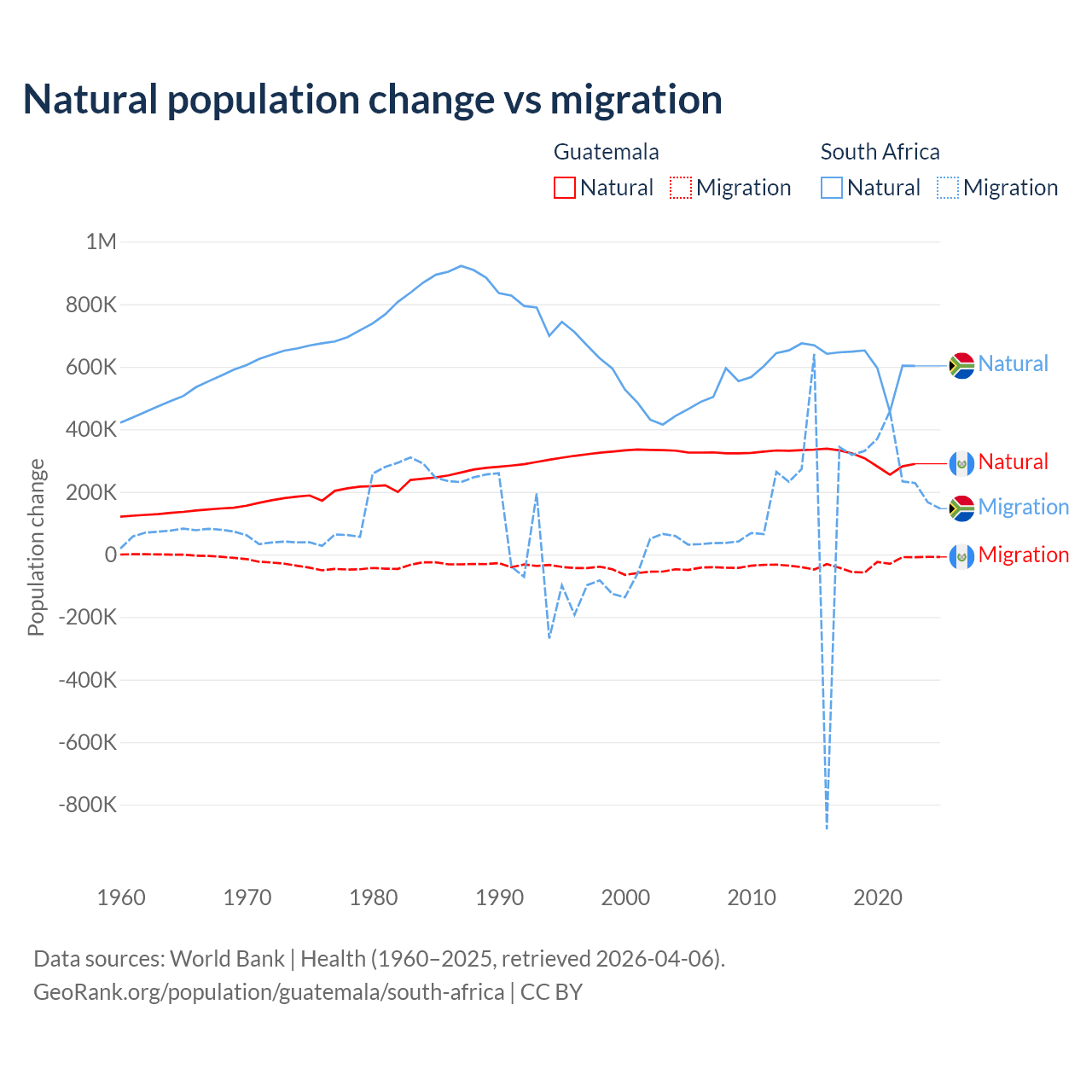 Over the last 10 years, 89.8% of the population change in Guatemala is from natural causes (a gain of 3,077,847 people) and 10.2% is from migration (a loss of 347,818 people). In South Africa 72.8% is from natural causes (a gain of 6,190,027 people) and 27.2% is from migration (a gain of 2,316,795 people).