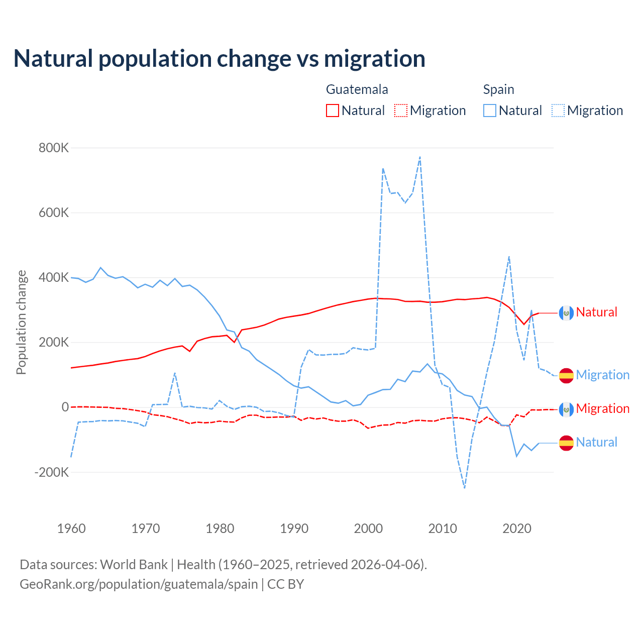 Over the last 10 years, 89.8% of the population change in Guatemala is from natural causes (a gain of 3,077,847 people) and 10.2% is from migration (a loss of 347,818 people). In Spain 25.8% is from natural causes (a loss of 627,829 people) and 74.2% is from migration (a gain of 1,810,127 people).