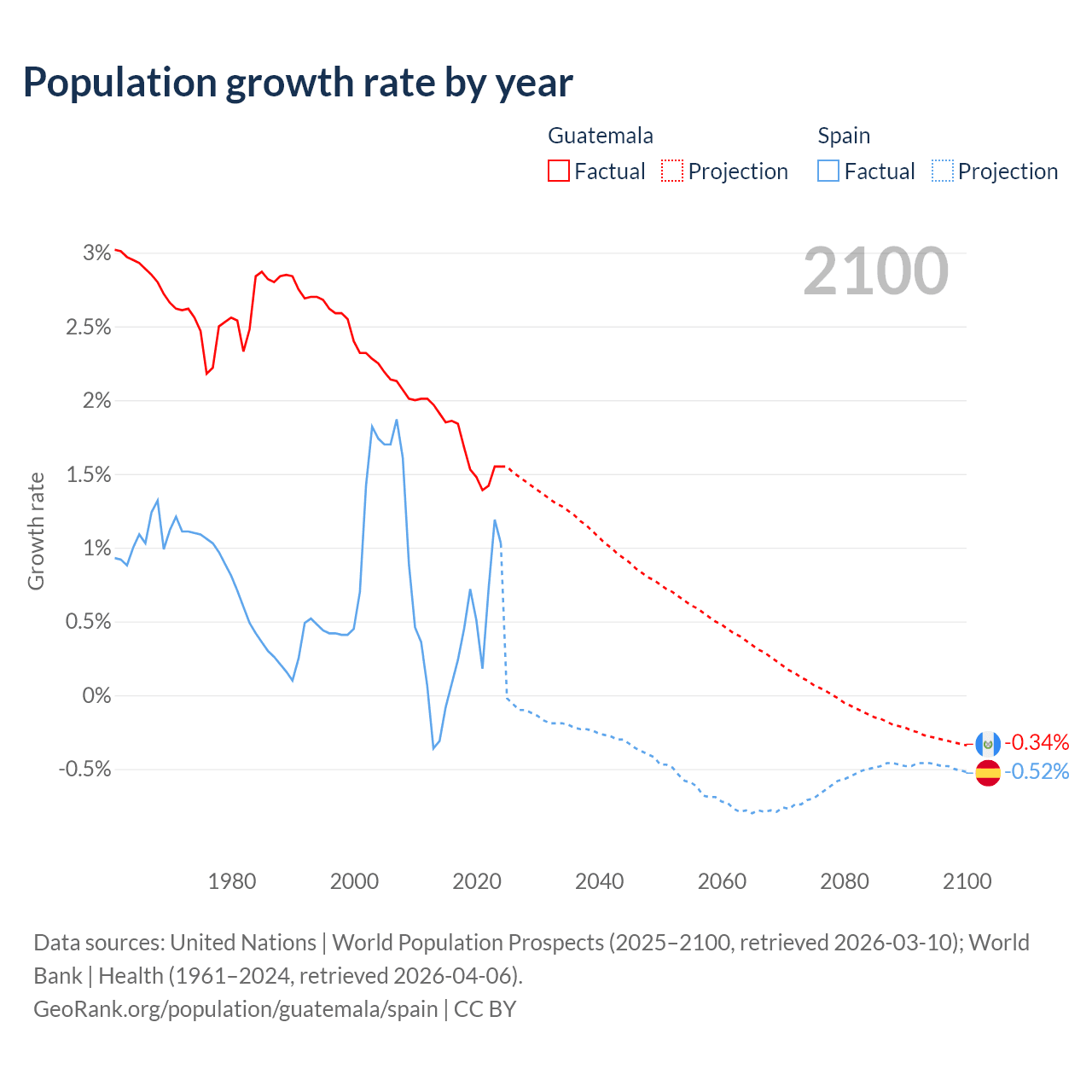 - For the last 10 years, Guatemala has had an average growth rate of +1.64% per year vs +0.43% in Spain.