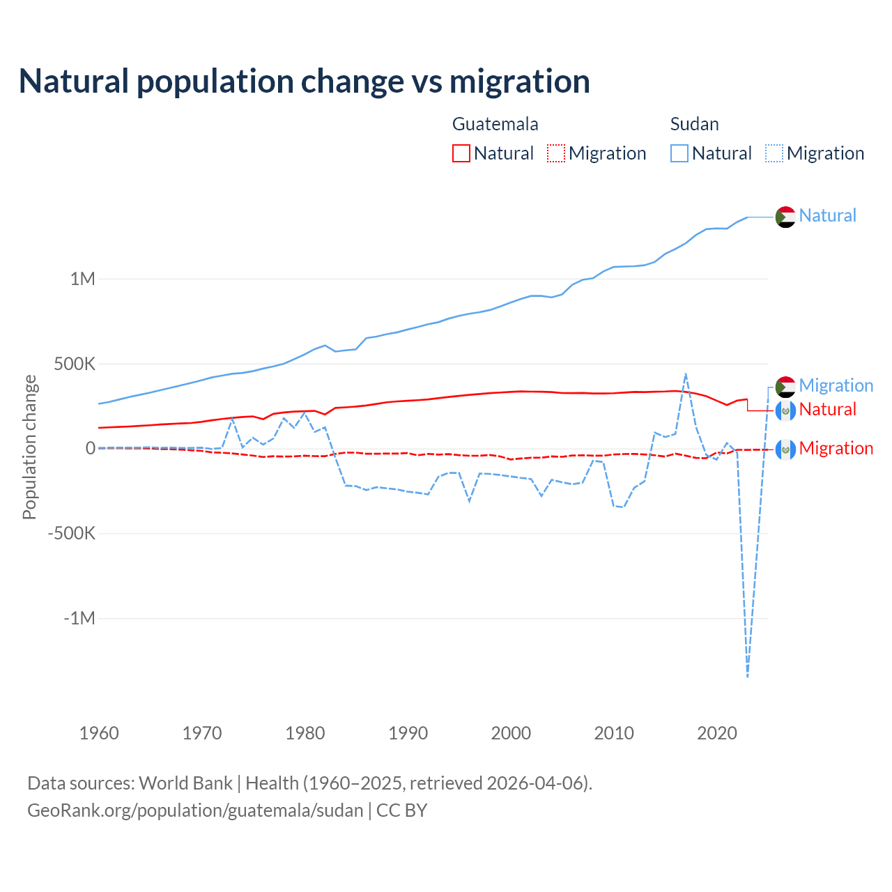 Over the last 10 years, 89.8% of the population change in Guatemala is from natural causes (a gain of 3,077,847 people) and 10.2% is from migration (a loss of 347,818 people). In Sudan 95.1% is from natural causes (a gain of 12,459,977 people) and 4.88% is from migration (a loss of 639,596 people).