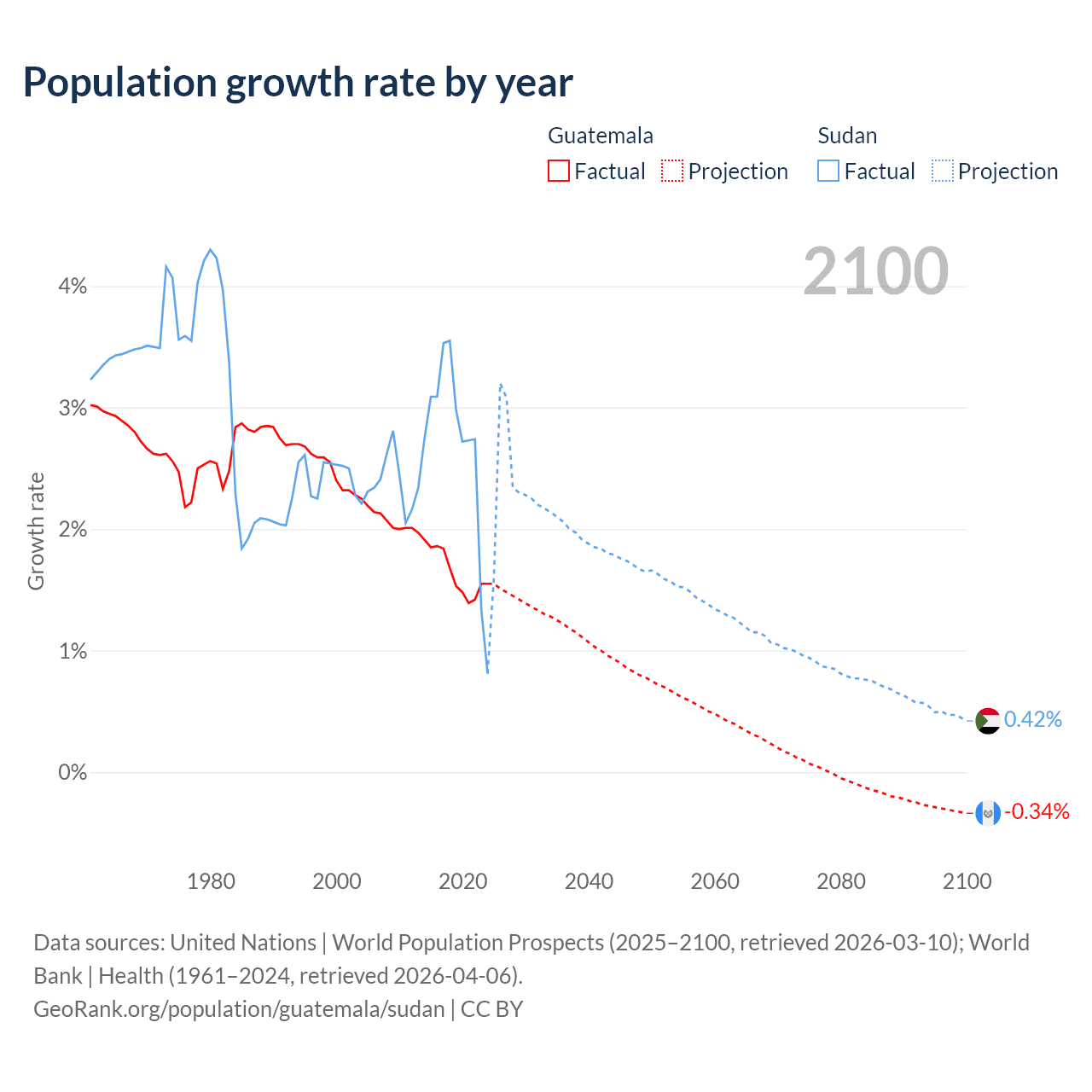 - For the last 10 years, Guatemala has had an average growth rate of +1.64% per year vs +2.67% in Sudan.
