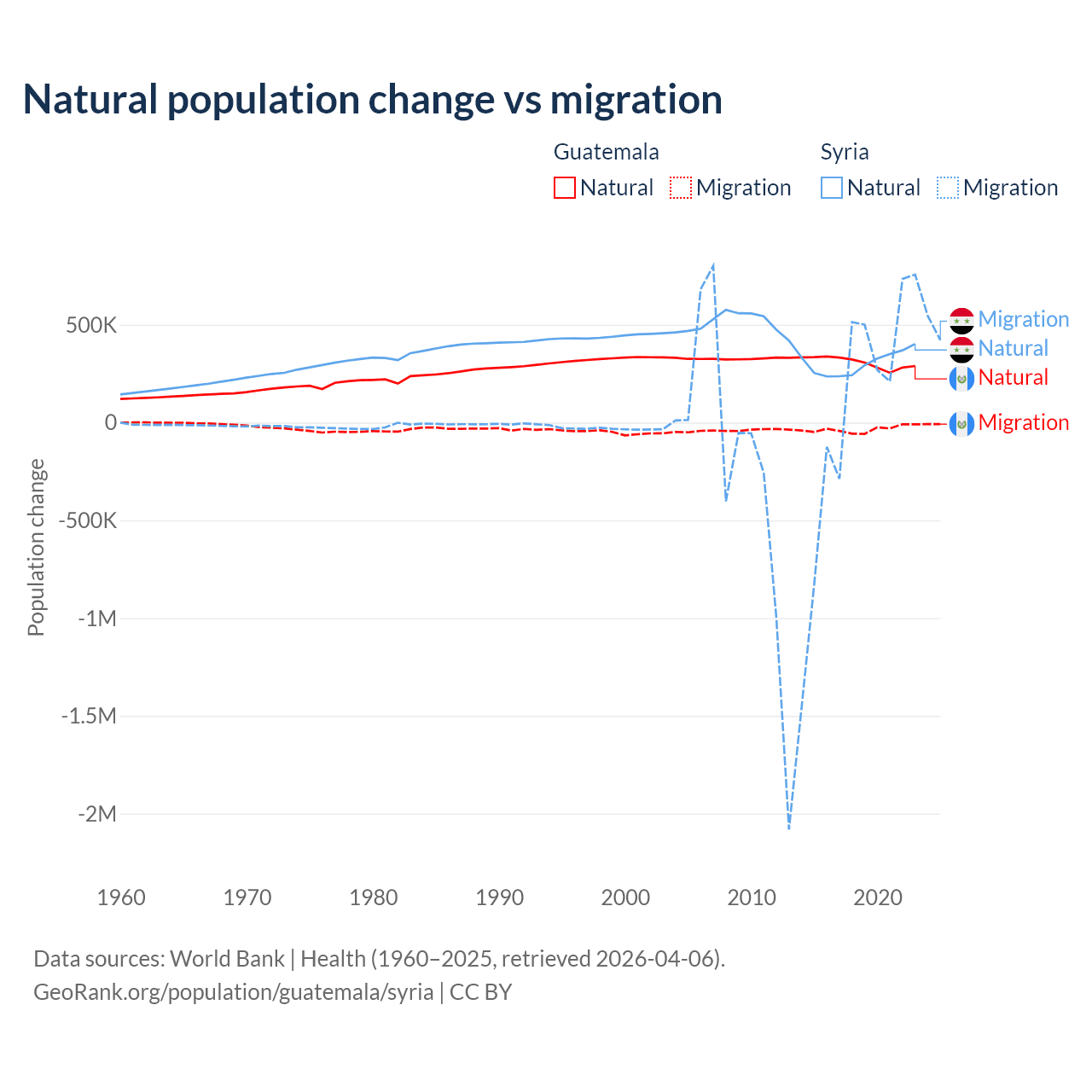 Over the last 10 years, 89.8% of the population change in Guatemala is from natural causes (a gain of 3,077,847 people) and 10.2% is from migration (a loss of 347,818 people). In Syria 91.3% is from natural causes (a gain of 3,047,621 people) and 8.72% is from migration (a gain of 291,069 people).