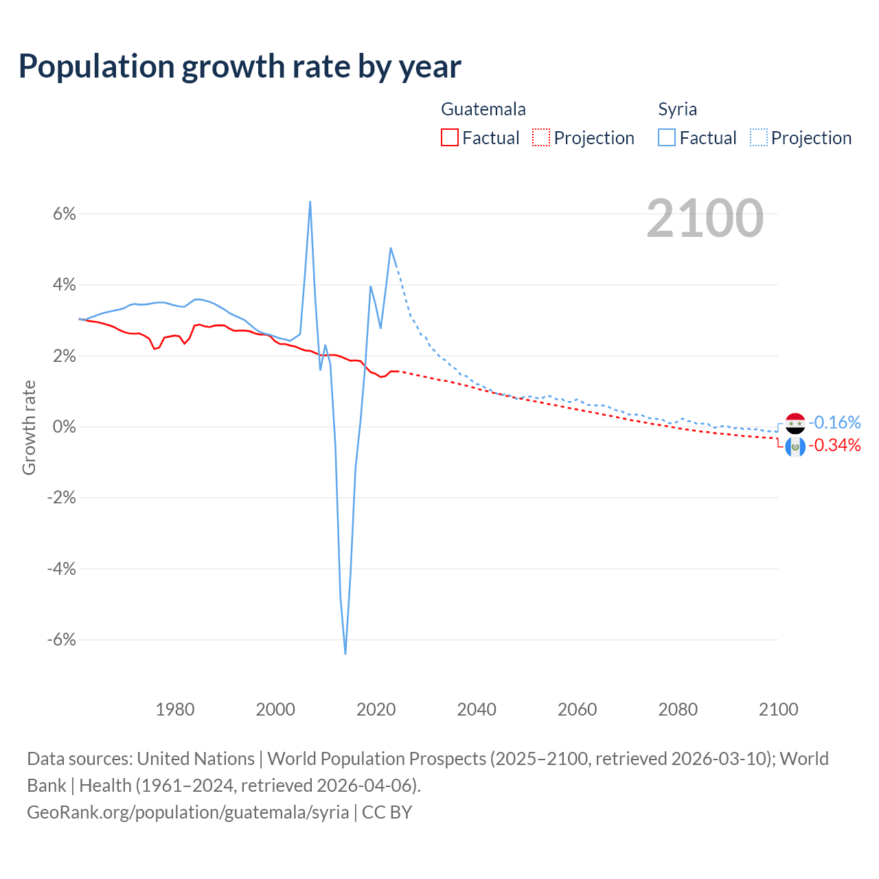 - For the last 10 years, Guatemala has had an average growth rate of +1.64% per year vs +1.25% in Syria.