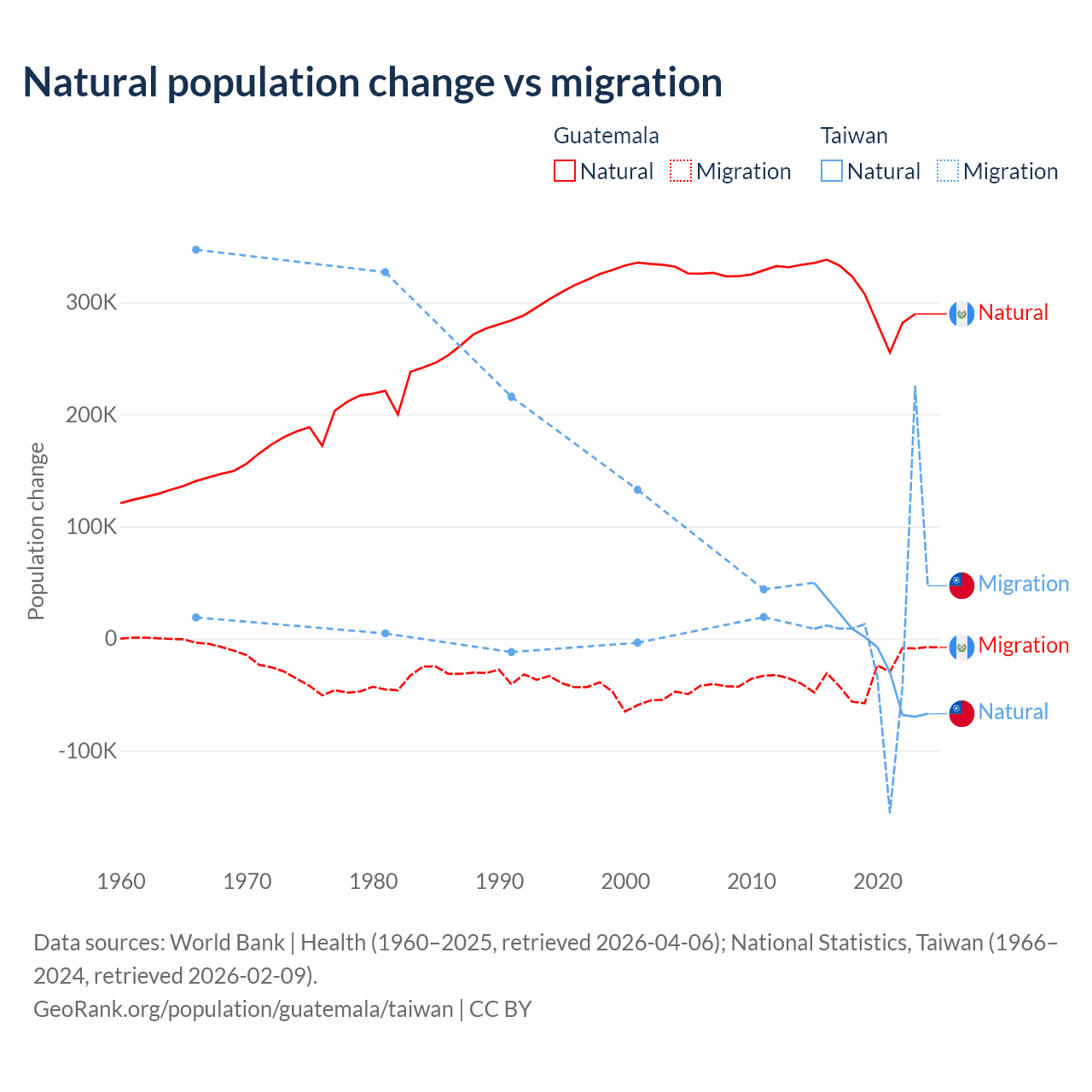 Over the last 10 years, 89.8% of the population change in Guatemala is from natural causes (a gain of 3,077,847 people) and 10.2% is from migration (a loss of 347,818 people). In Taiwan 56.7% is from natural causes (a loss of 57,467 people) and 43.3% is from migration (a gain of 43,884 people).