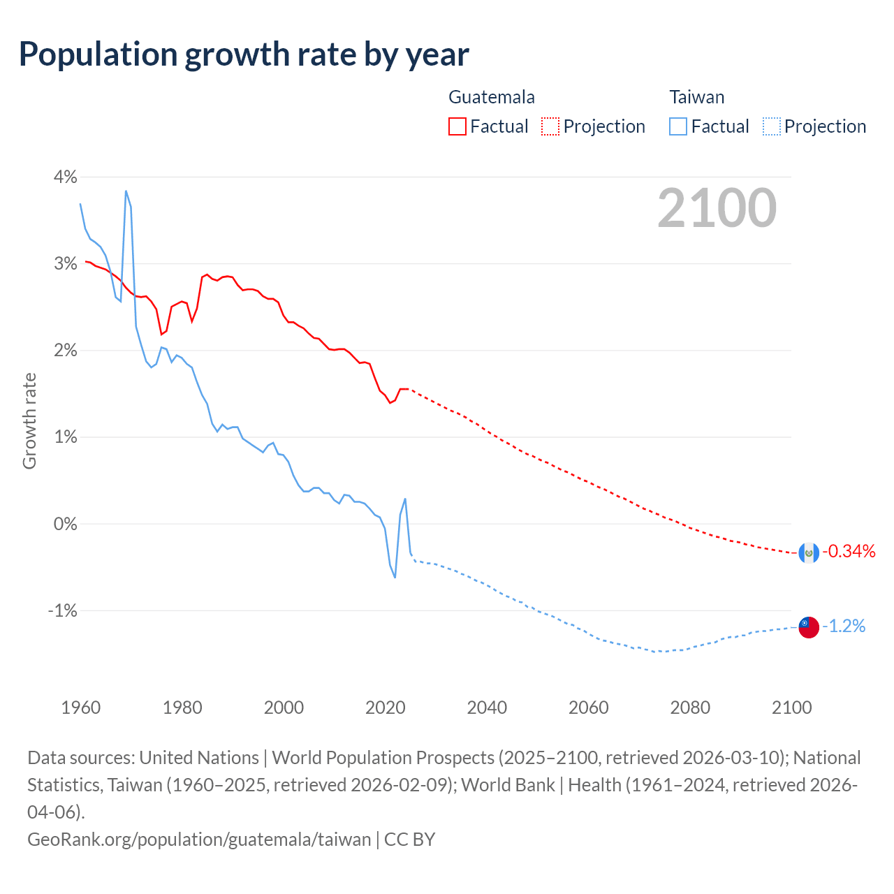 - For the last 10 years, Guatemala has had an average growth rate of +1.64% per year vs -0.03% in Taiwan.