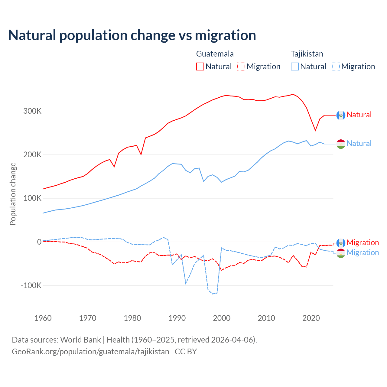 Over the last 10 years, 89.8% of the population change in Guatemala is from natural causes (a gain of 3,077,847 people) and 10.2% is from migration (a loss of 347,818 people). In Tajikistan 96% is from natural causes (a gain of 2,266,045 people) and 3.95% is from migration (a loss of 93,205 people).
