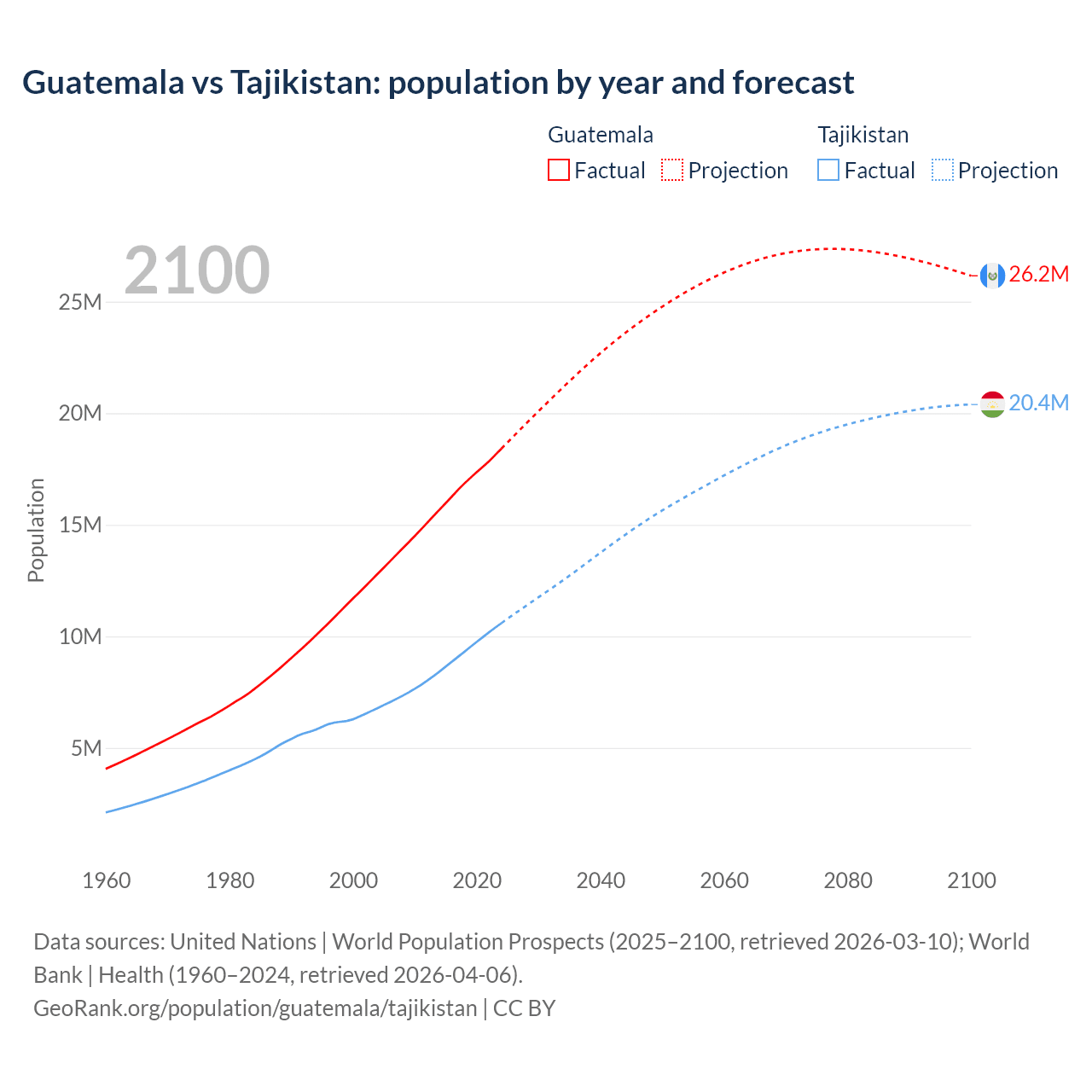 The latest officially reported population of Guatemala was 18,406,359 in 2024 vs 10,590,927 people in Tajikistan in 2024. In 2026, based on the adjusted UN estimation, the current Guatemala's population is 19,049,936 people compared to 11,038,274 in Tajikistan.