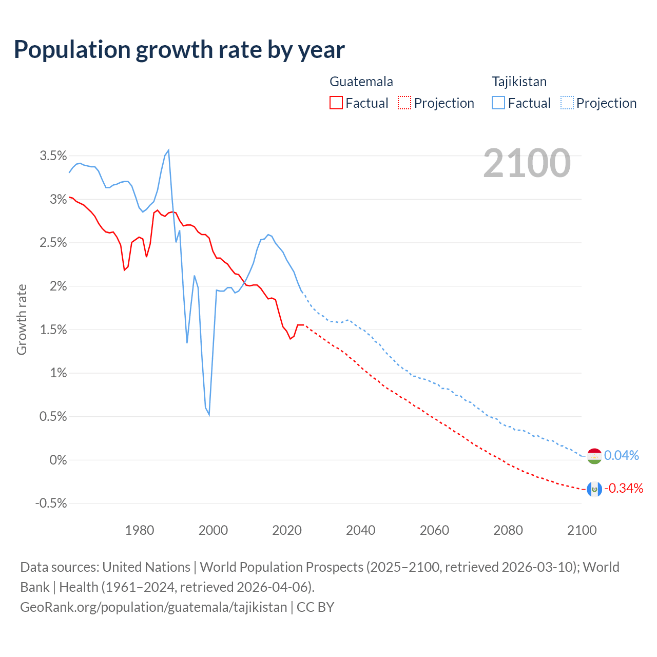 - For the last 10 years, Guatemala has had an average growth rate of +1.64% per year vs +2.33% in Tajikistan.
