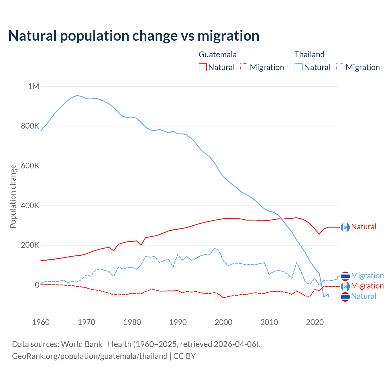 Over the last 10 years, 89.8% of the population change in Guatemala is from natural causes (a gain of 3,077,847 people) and 10.2% is from migration (a loss of 347,818 people). In Thailand 78.4% is from natural causes (a gain of 1,292,528 people) and 21.6% is from migration (a gain of 355,361 people).