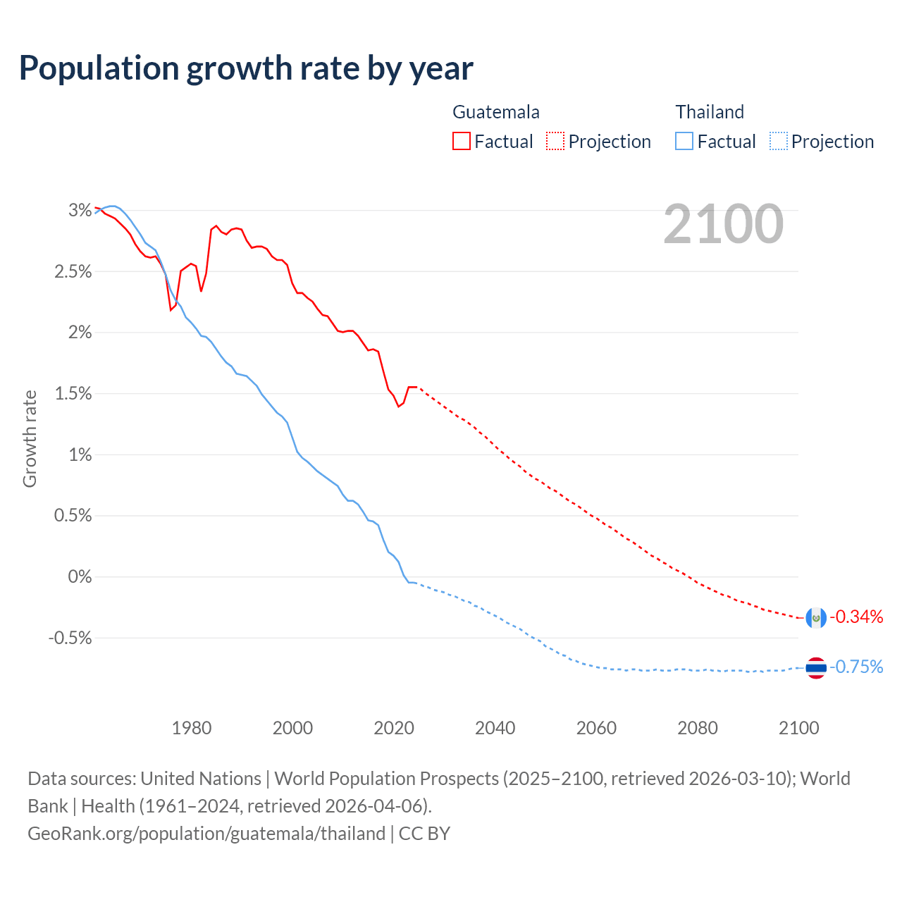 - For the last 10 years, Guatemala has had an average growth rate of +1.64% per year vs +0.23% in Thailand.