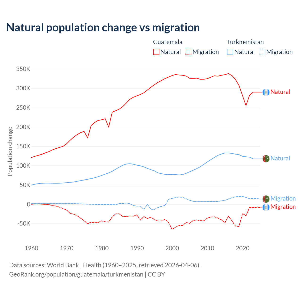 Over the last 10 years, 89.8% of the population change in Guatemala is from natural causes (a gain of 3,077,847 people) and 10.2% is from migration (a loss of 347,818 people). In Turkmenistan 89.2% is from natural causes (a gain of 1,270,228 people) and 10.8% is from migration (a gain of 154,379 people).
