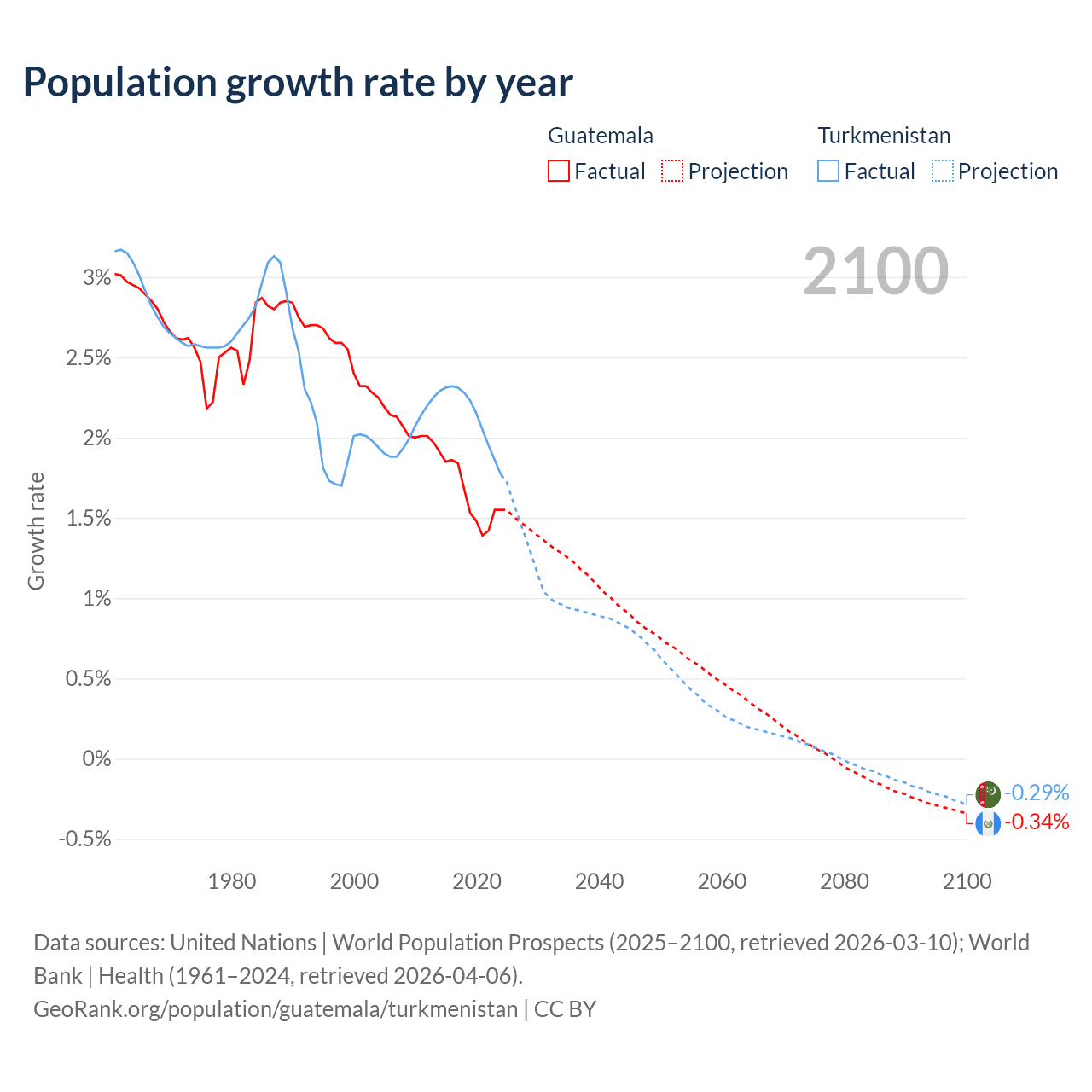 - For the last 10 years, Guatemala has had an average growth rate of +1.64% per year vs +2.14% in Turkmenistan.
