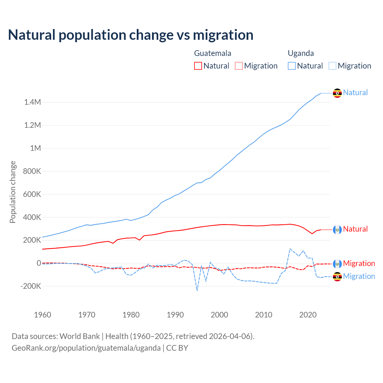 Over the last 10 years, 89.8% of the population change in Guatemala is from natural causes (a gain of 3,077,847 people) and 10.2% is from migration (a loss of 347,818 people). In Uganda 99.5% is from natural causes (a gain of 13,419,712 people) and 0.53% is from migration (a gain of 71,457 people).