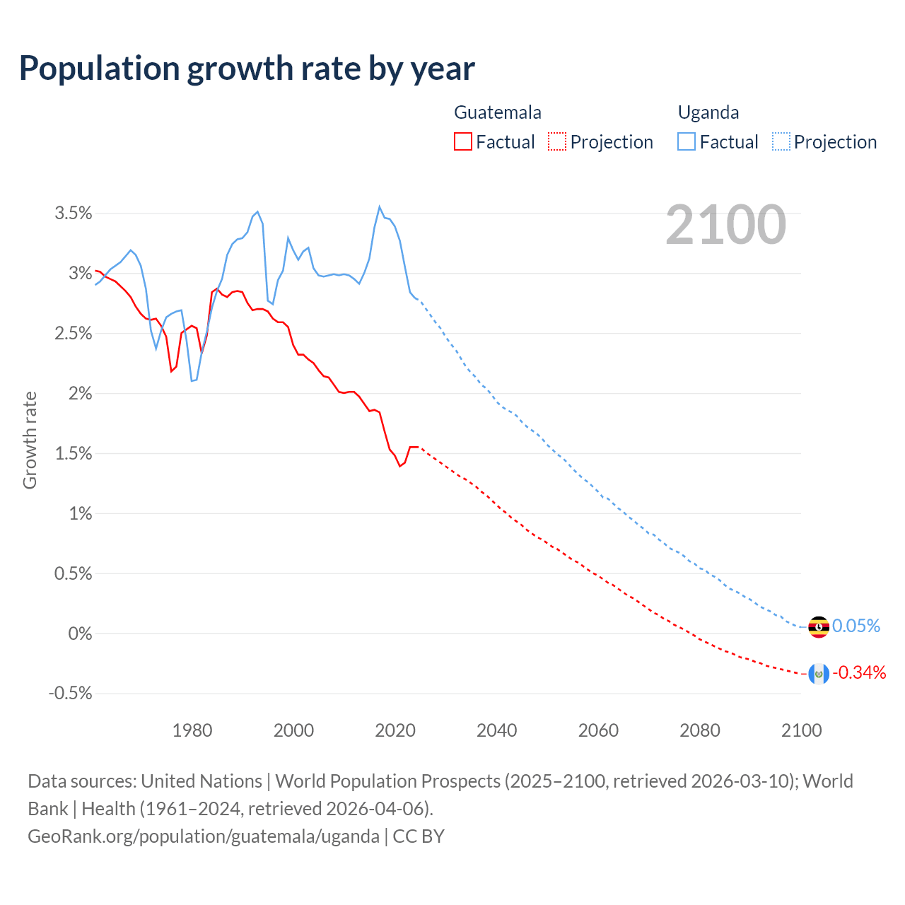 - For the last 10 years, Guatemala has had an average growth rate of +1.64% per year vs +3.21% in Uganda.