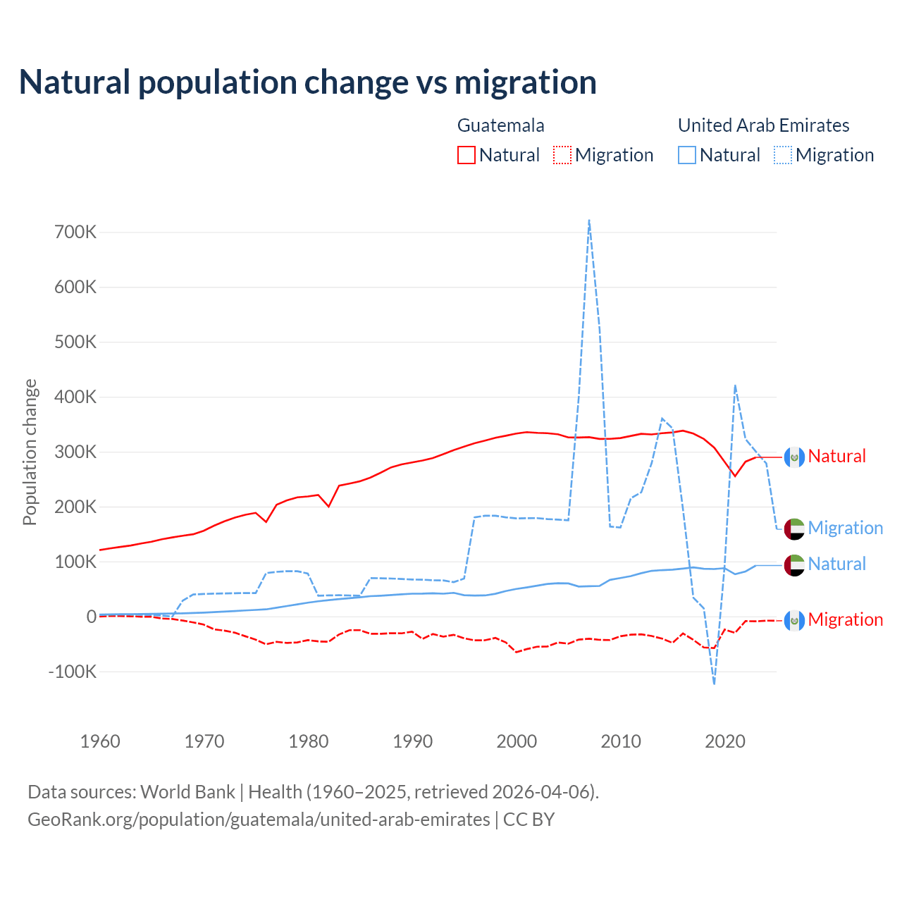 Over the last 10 years, 89.8% of the population change in Guatemala is from natural causes (a gain of 3,077,847 people) and 10.2% is from migration (a loss of 347,818 people). In the United Arab Emirates 30.5% is from natural causes (a gain of 857,996 people) and 69.5% is from migration (a gain of 1,958,520 people).