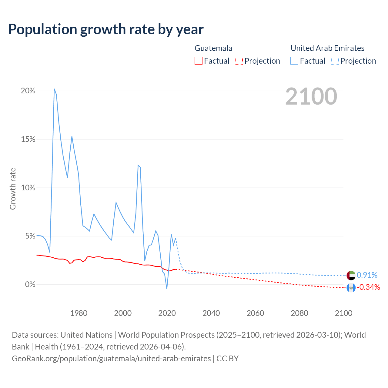 - For the last 10 years, Guatemala has had an average growth rate of +1.64% per year vs +3.31% in the United Arab Emirates.
