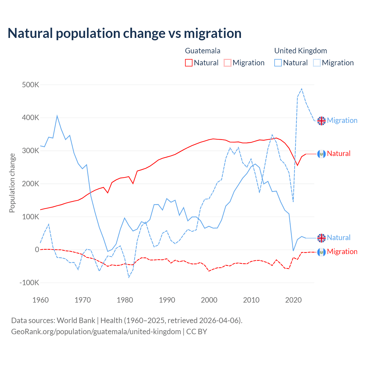 Over the last 10 years, 89.8% of the population change in Guatemala is from natural causes (a gain of 3,077,847 people) and 10.2% is from migration (a loss of 347,818 people). In the United Kingdom 23.9% is from natural causes (a gain of 1,033,129 people) and 76.1% is from migration (a gain of 3,283,101 people).