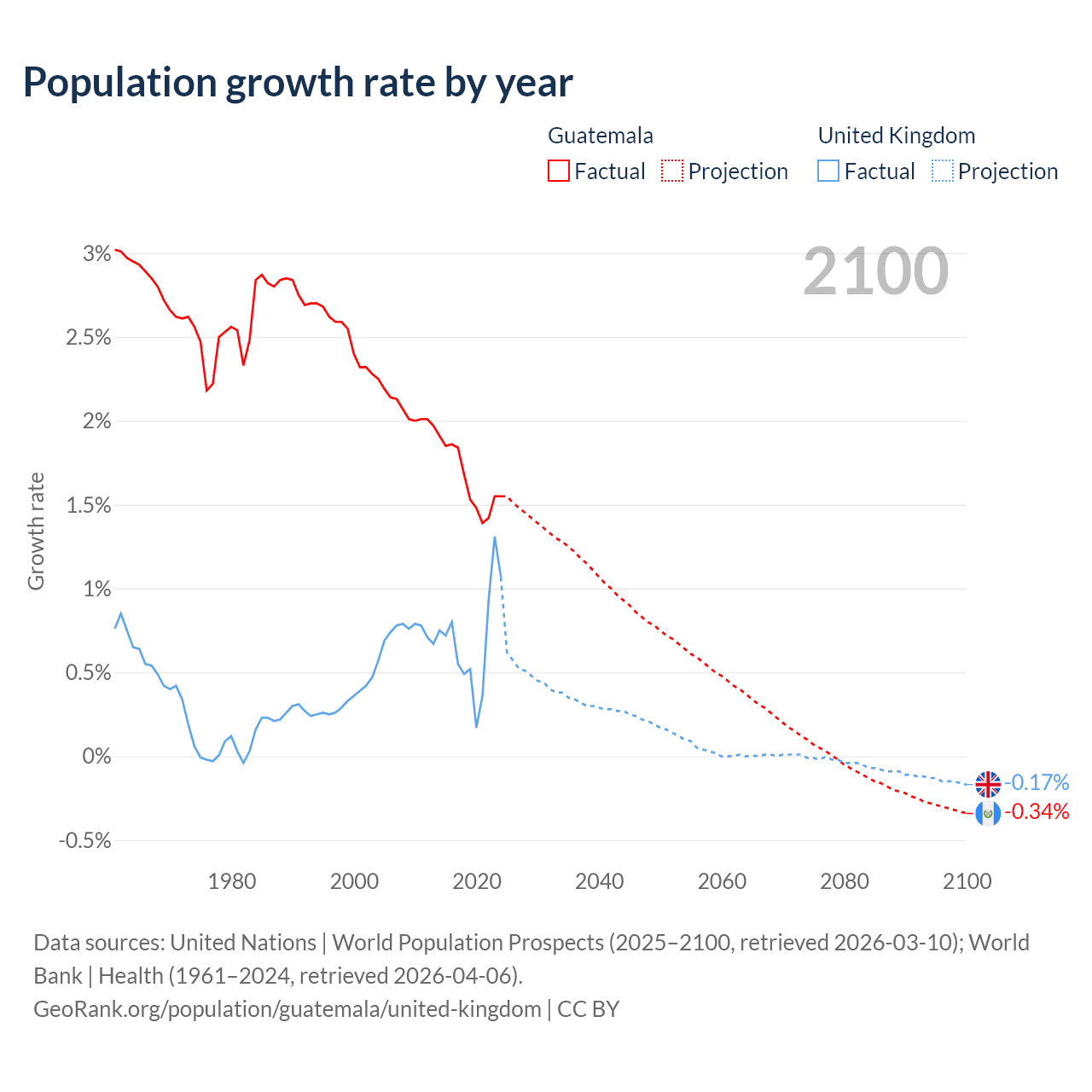 - For the last 10 years, Guatemala has had an average growth rate of +1.64% per year vs +0.7% in the United Kingdom.