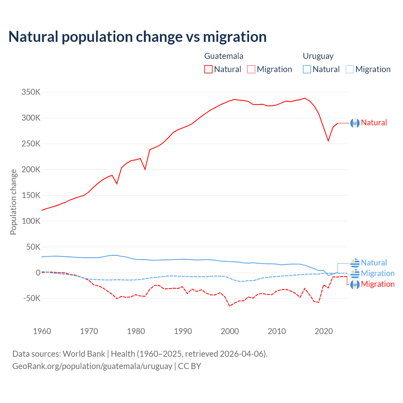 Over the last 10 years, 89.8% of the population change in Guatemala is from natural causes (a gain of 3,077,847 people) and 10.2% is from migration (a loss of 347,818 people). In Uruguay 70% is from natural causes (a gain of 64,303 people) and 30% is from migration (a loss of 27,501 people).