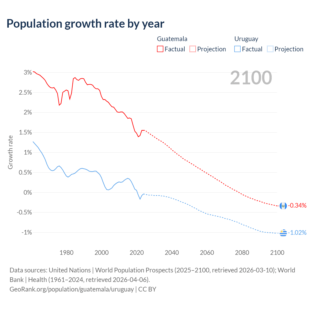 - For the last 10 years, Guatemala has had an average growth rate of +1.64% per year vs +0.11% in Uruguay.
