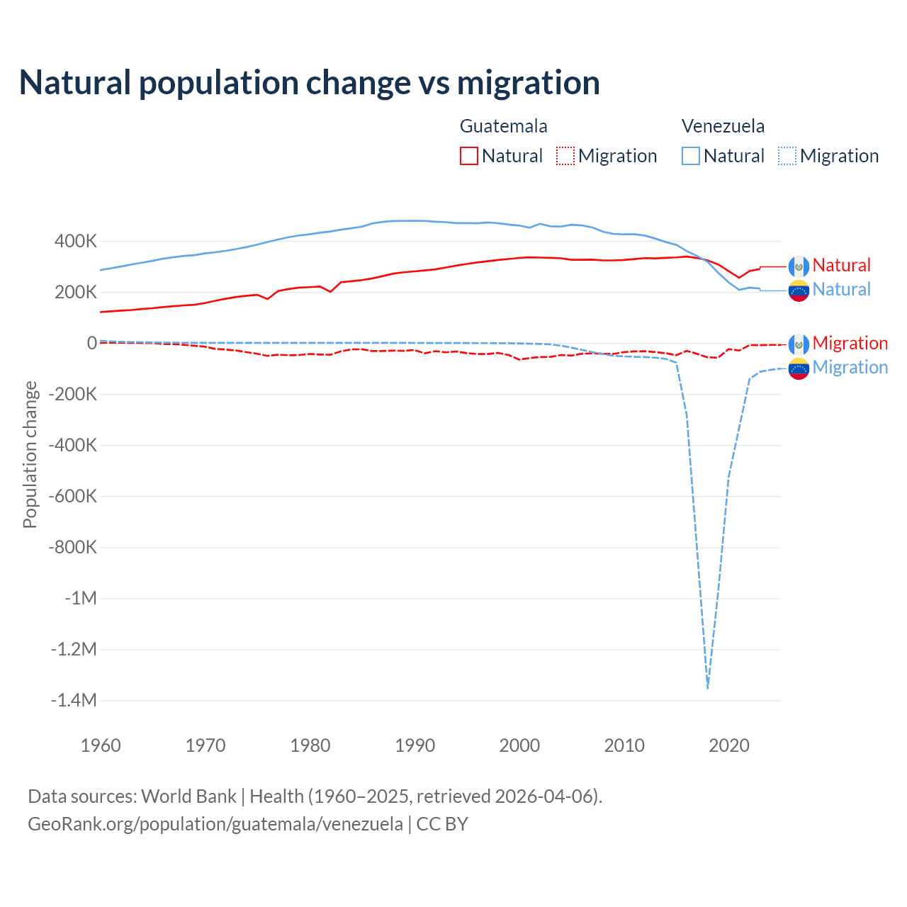 Over the last 10 years, 89.8% of the population change in Guatemala is from natural causes (a gain of 3,077,847 people) and 10.2% is from migration (a loss of 347,818 people). In Venezuela 38.6% is from natural causes (a gain of 2,946,257 people) and 61.4% is from migration (a loss of 4,683,227 people).