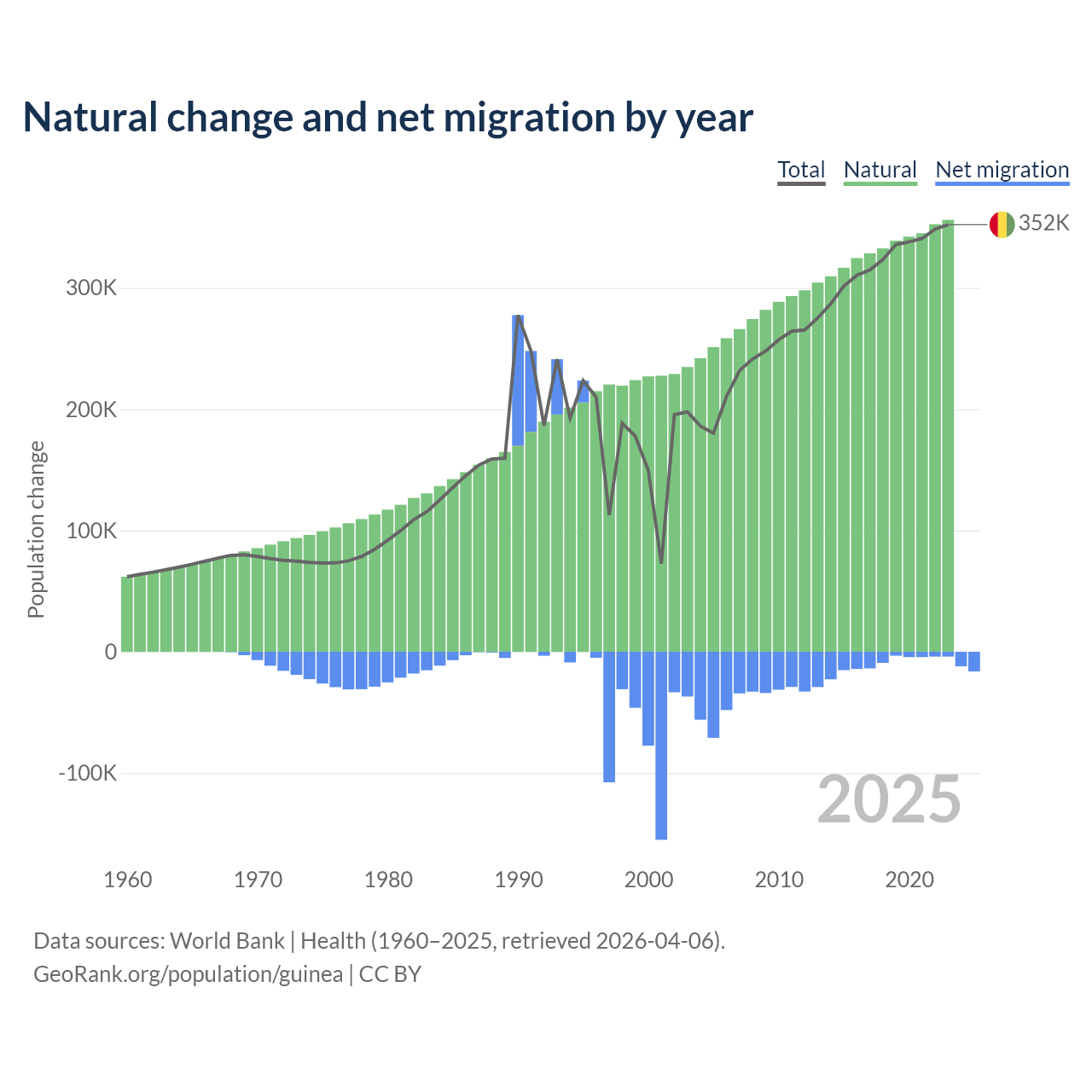 Over the last 10 years, 97.2% of the population change in Guinea is from natural causes (a gain of 3,346,936 people) and 2.76% is from migration (a loss of 94,924 people).