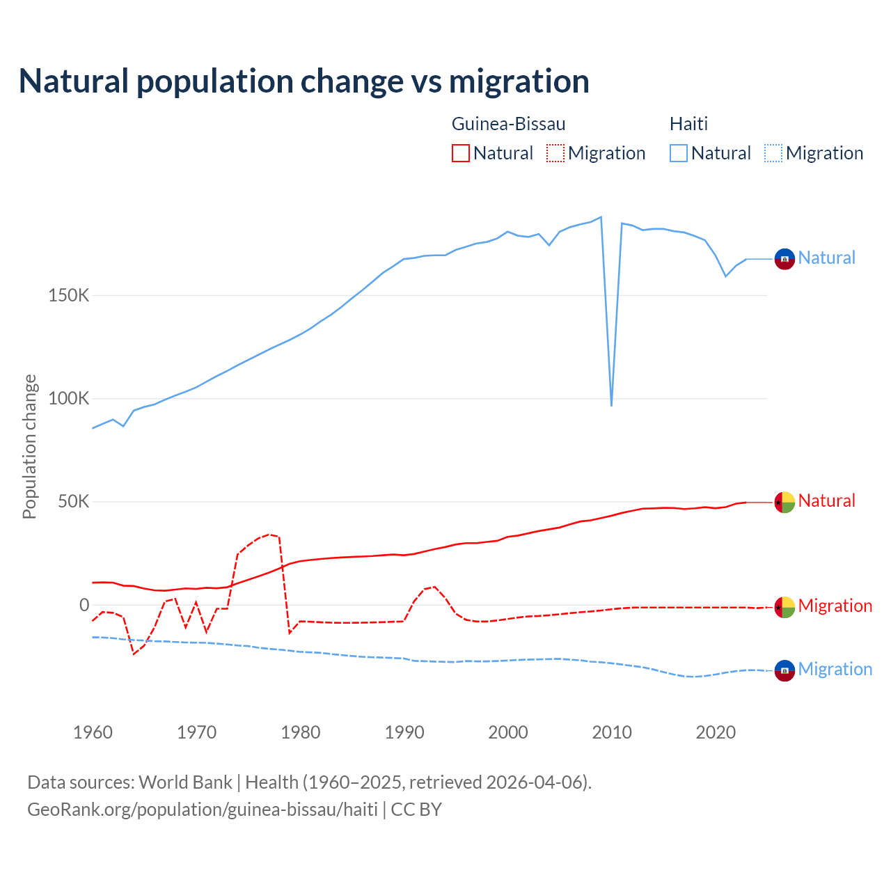 Over the last 10 years, 97.1% of the population change in Guinea-Bissau is from natural causes (a gain of 472,826 people) and 2.87% is from migration (a loss of 13,956 people). In Haiti 83.9% is from natural causes (a gain of 1,740,319 people) and 16.1% is from migration (a loss of 333,076 people).