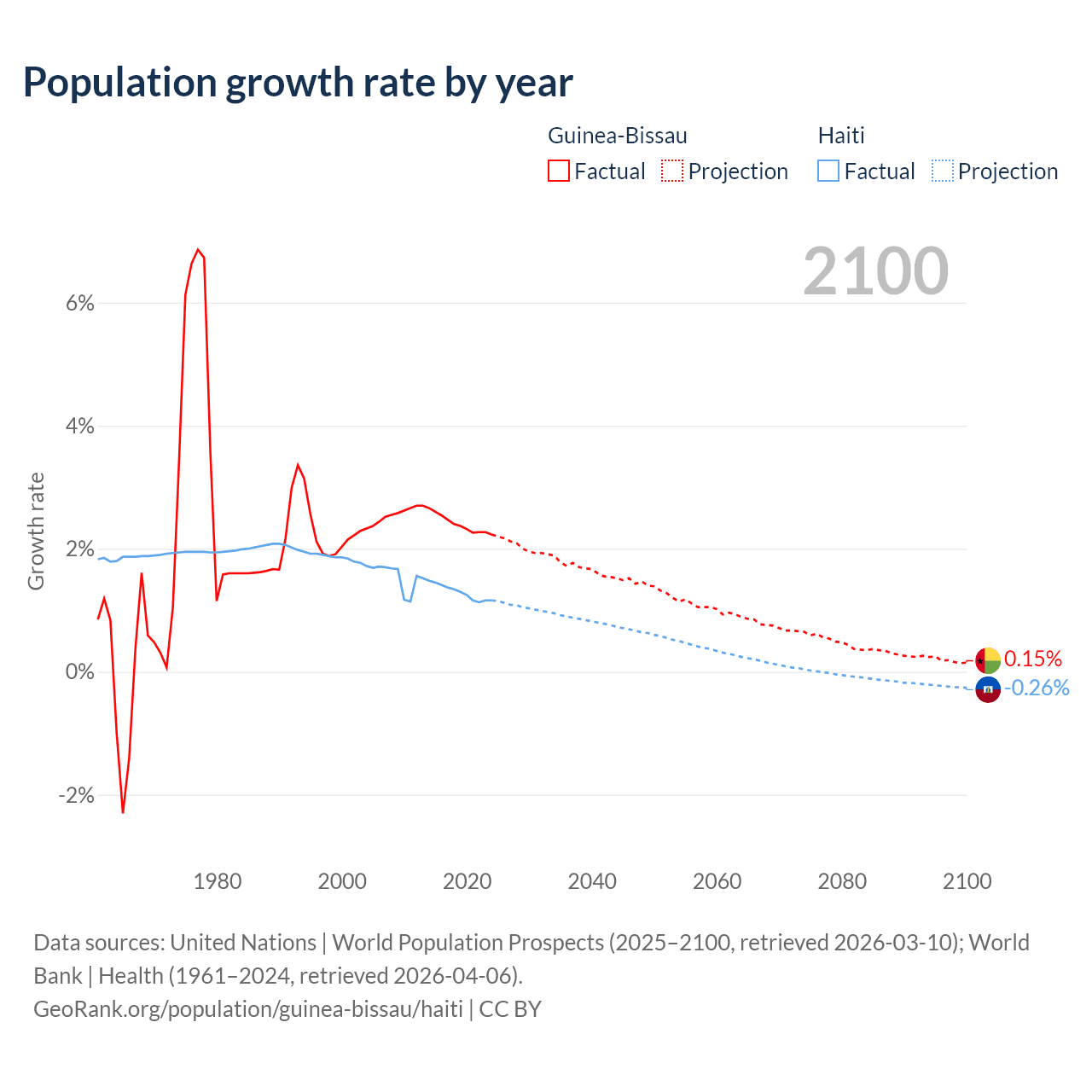 - For the last 10 years, Guinea-Bissau has had an average growth rate of +2.4% per year vs +1.29% in Haiti.