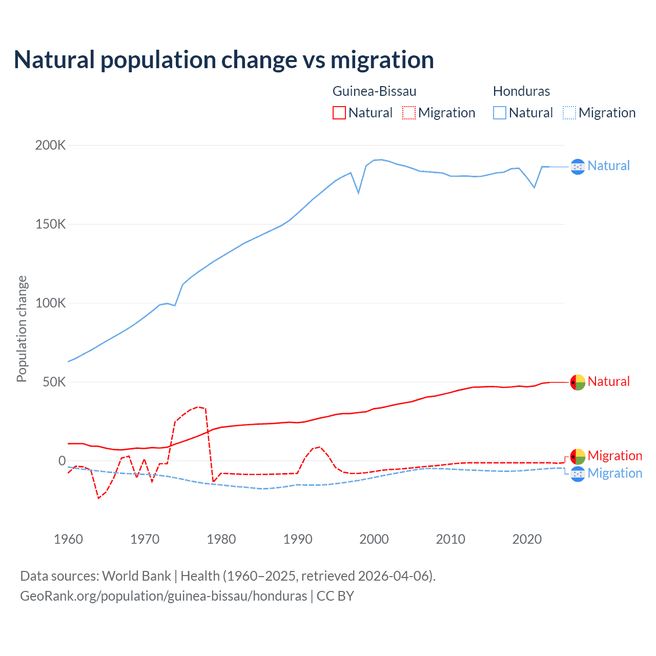 Over the last 10 years, 97.1% of the population change in Guinea-Bissau is from natural causes (a gain of 472,826 people) and 2.87% is from migration (a loss of 13,956 people). In Honduras 96.7% is from natural causes (a gain of 1,821,125 people) and 3.29% is from migration (a loss of 61,965 people).