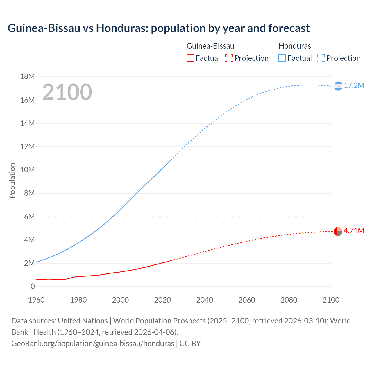 Guinea-Bissau vs Honduras: population by year and forecast