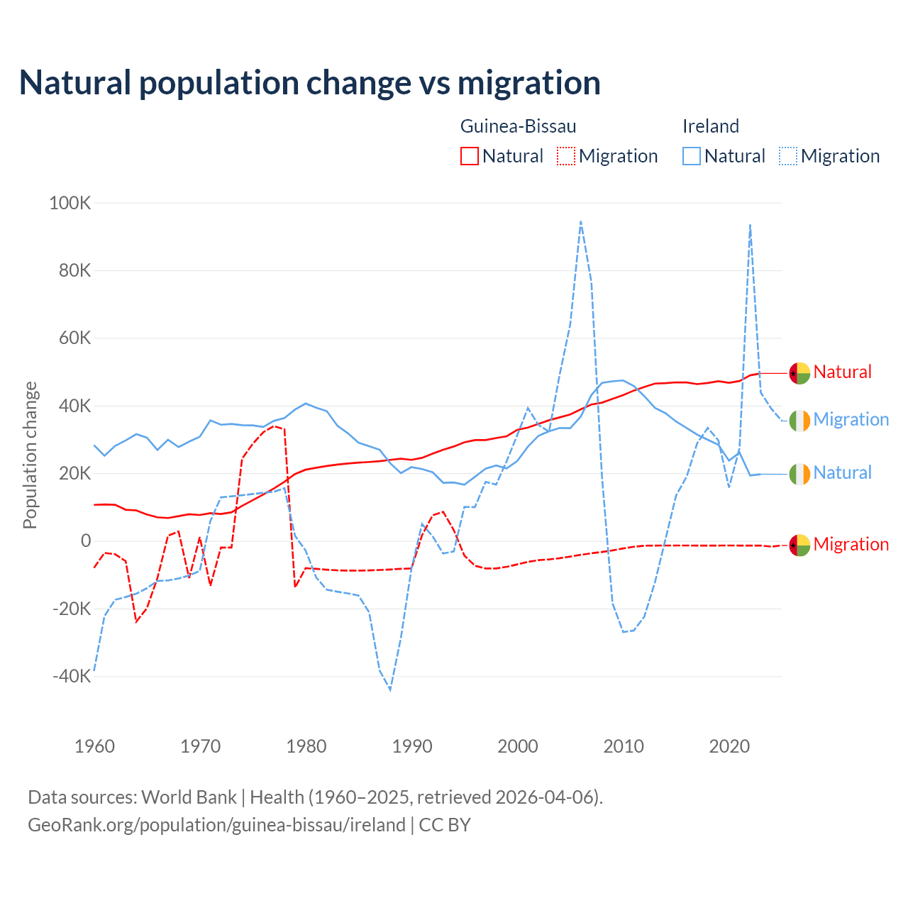 Over the last 10 years, 97.1% of the population change in Guinea-Bissau is from natural causes (a gain of 472,826 people) and 2.87% is from migration (a loss of 13,956 people). In Ireland 48.2% is from natural causes (a gain of 284,644 people) and 51.8% is from migration (a gain of 305,297 people).