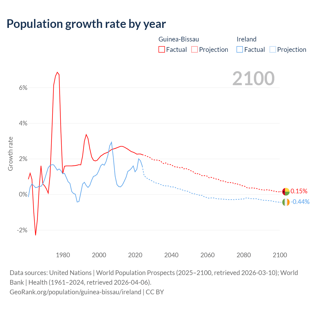 - For the last 10 years, Guinea-Bissau has had an average growth rate of +2.4% per year vs +1.41% in Ireland.