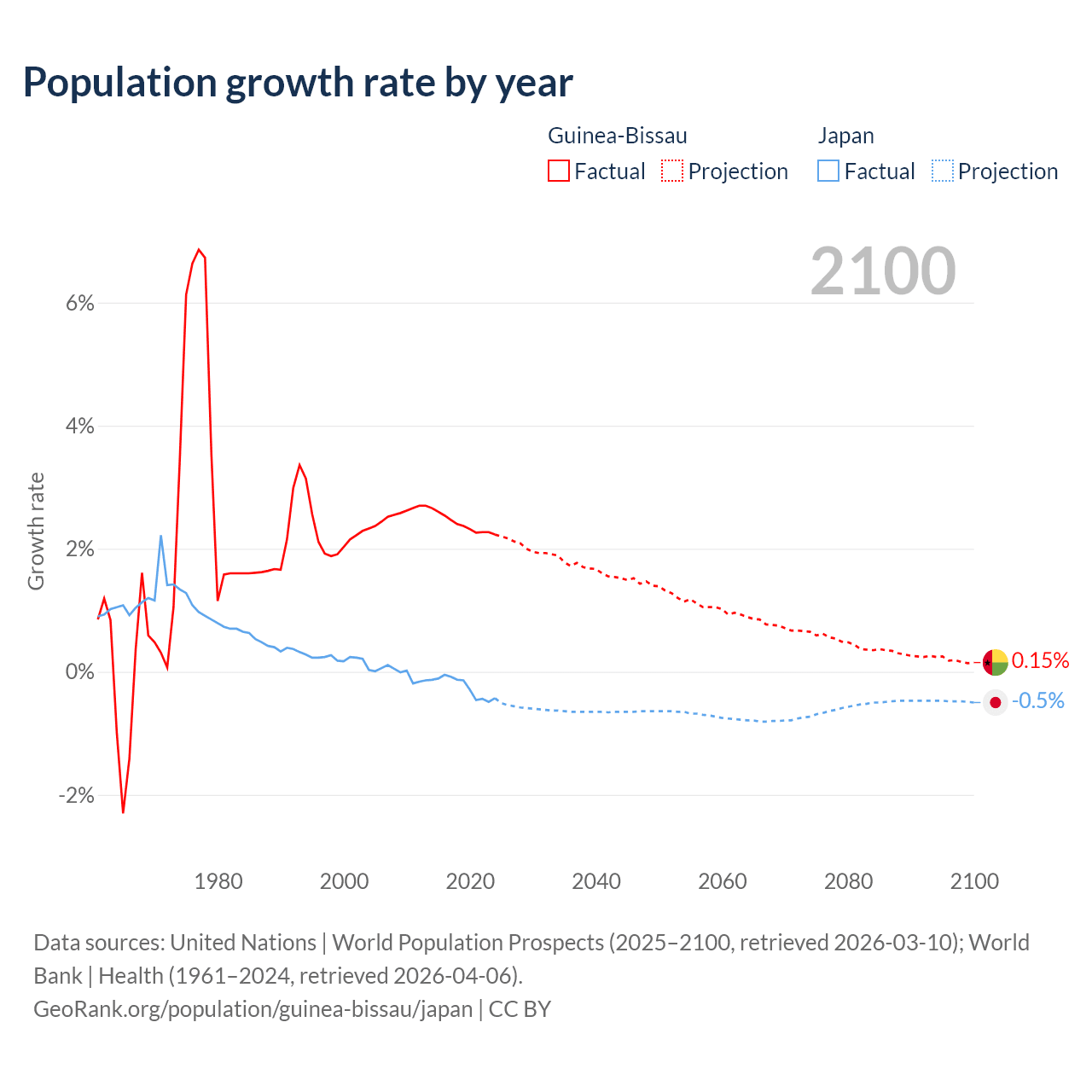 - For the last 10 years, Guinea-Bissau has had an average growth rate of +2.4% per year vs -0.25% in Japan.