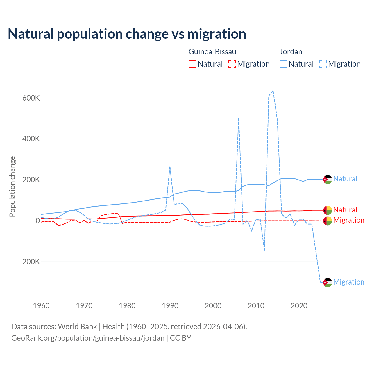 Over the last 10 years, 97.1% of the population change in Guinea-Bissau is from natural causes (a gain of 472,826 people) and 2.87% is from migration (a loss of 13,956 people). In Jordan 63.2% is from natural causes (a gain of 1,991,452 people) and 36.8% is from migration (a gain of 1,157,625 people).