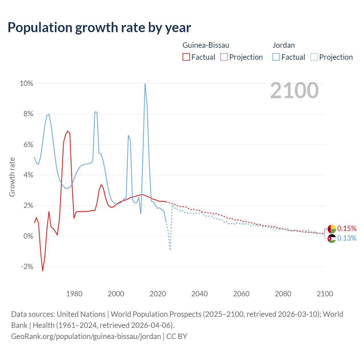 - For the last 10 years, Guinea-Bissau has had an average growth rate of +2.4% per year vs +3.45% in Jordan.