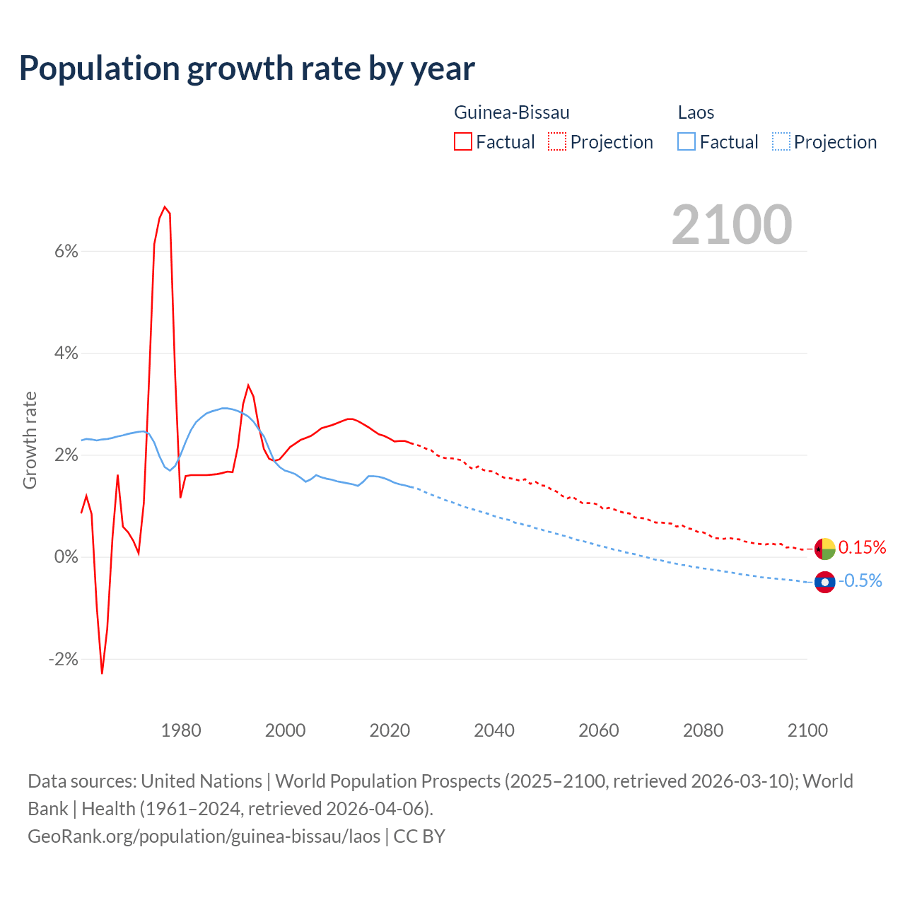 - For the last 10 years, Guinea-Bissau has had an average growth rate of +2.4% per year vs +1.48% in Laos.