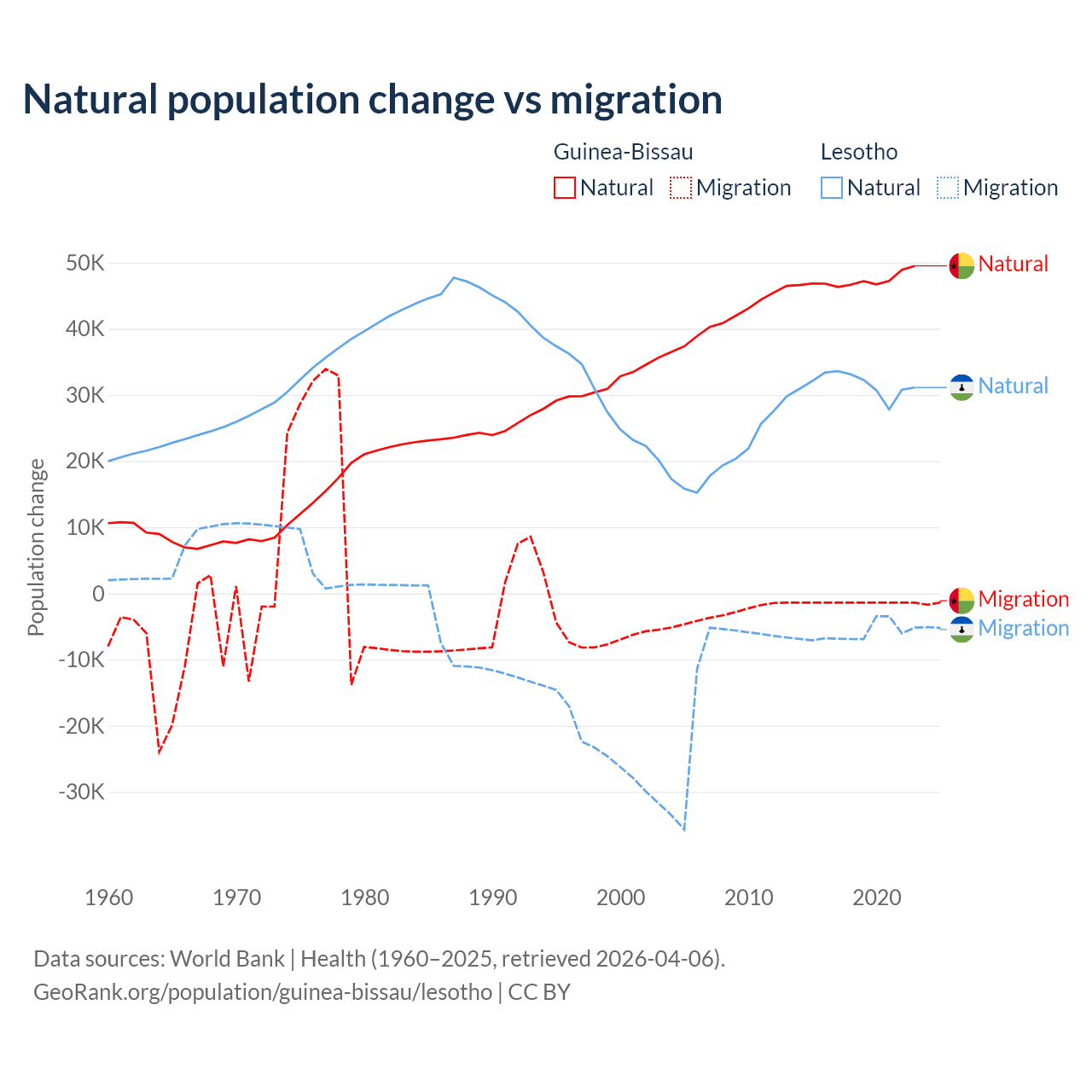 Over the last 10 years, 97.1% of the population change in Guinea-Bissau is from natural causes (a gain of 472,826 people) and 2.87% is from migration (a loss of 13,956 people). In Lesotho 84.2% is from natural causes (a gain of 315,836 people) and 15.8% is from migration (a loss of 59,457 people).