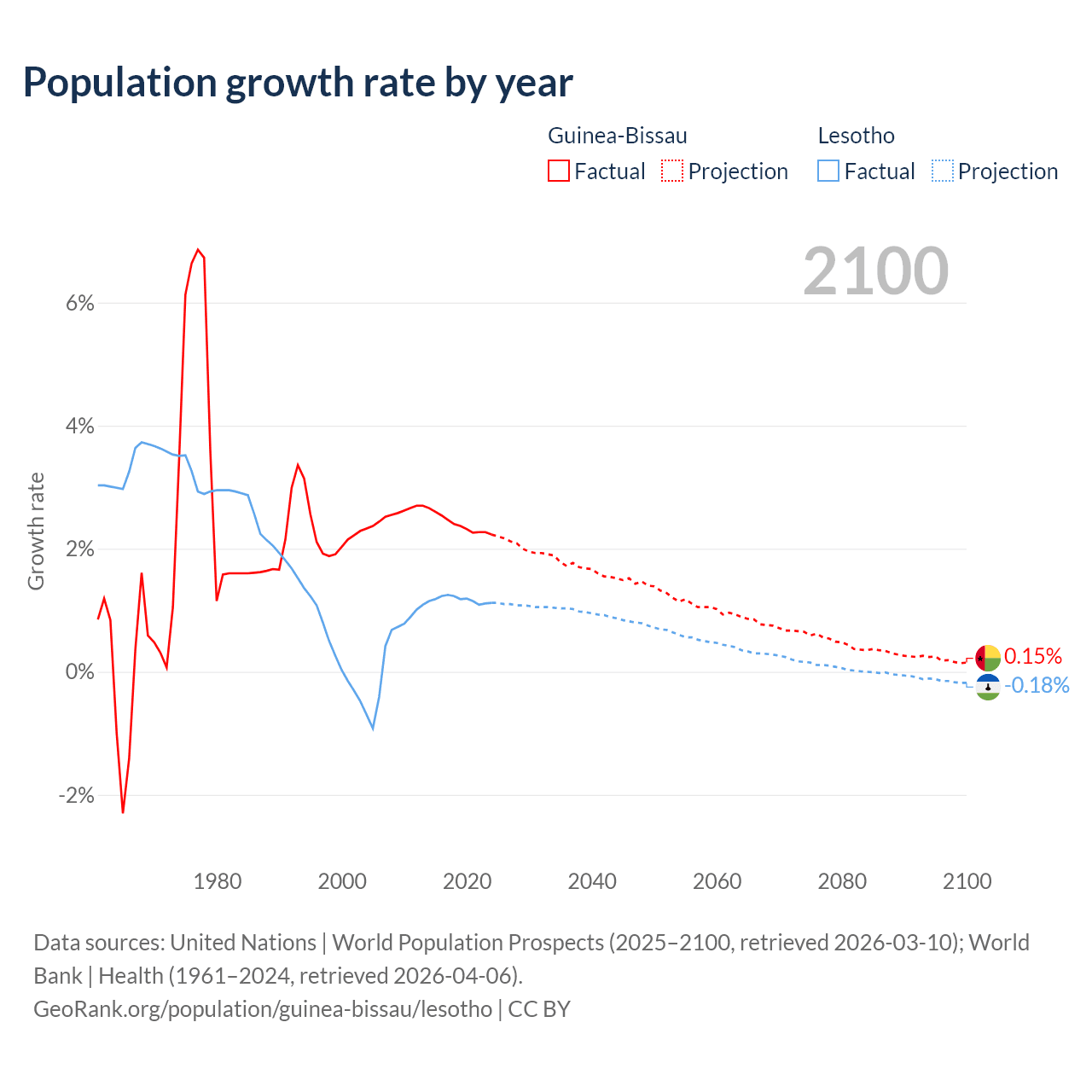 - For the last 10 years, Guinea-Bissau has had an average growth rate of +2.4% per year vs +1.17% in Lesotho.