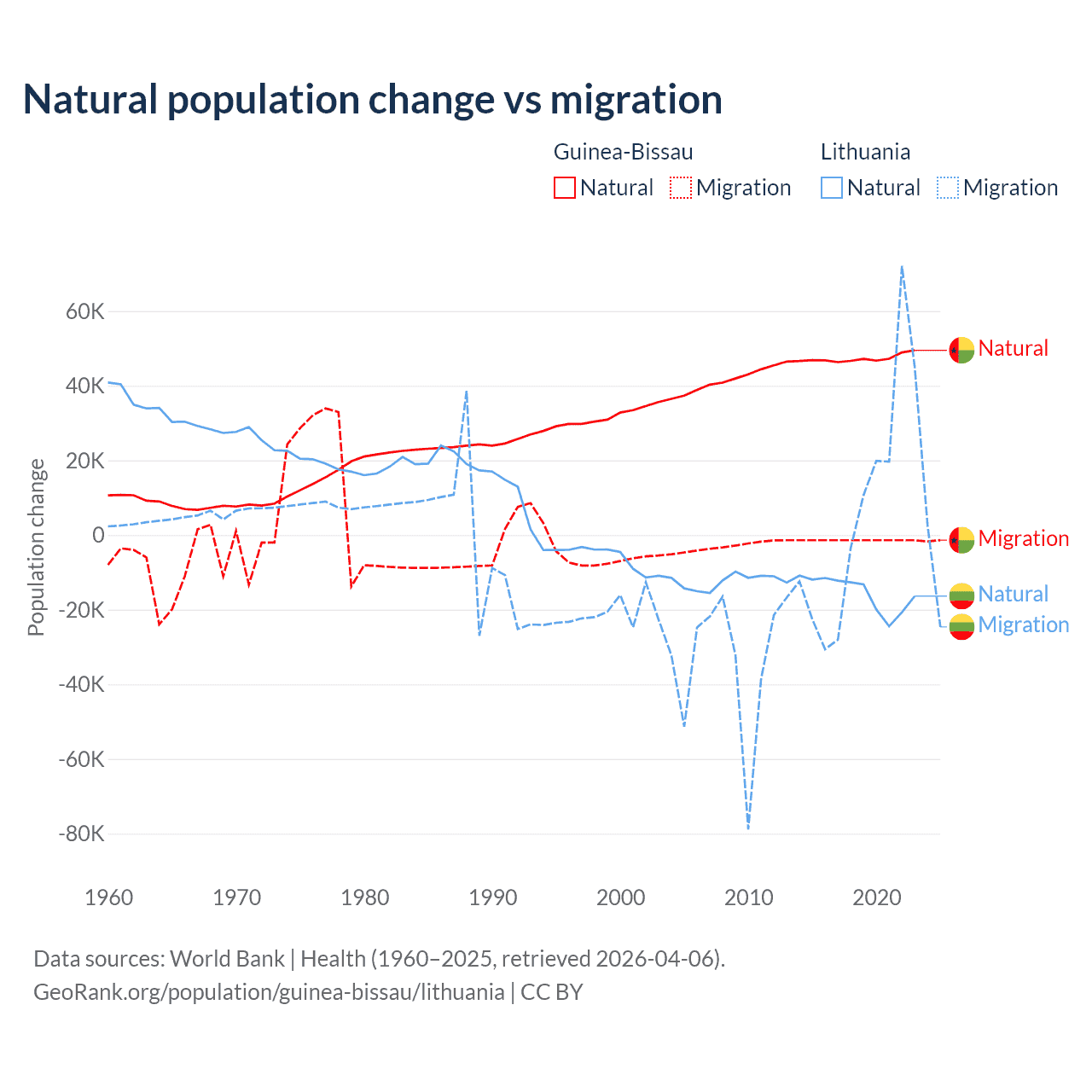 Over the last 10 years, 97.1% of the population change in Guinea-Bissau is from natural causes (a gain of 472,826 people) and 2.87% is from migration (a loss of 13,956 people). In Lithuania 68.7% is from natural causes (a loss of 153,859 people) and 31.3% is from migration (a gain of 70,196 people).