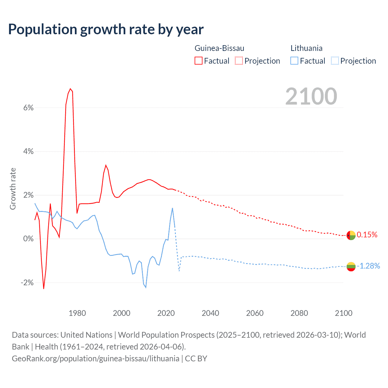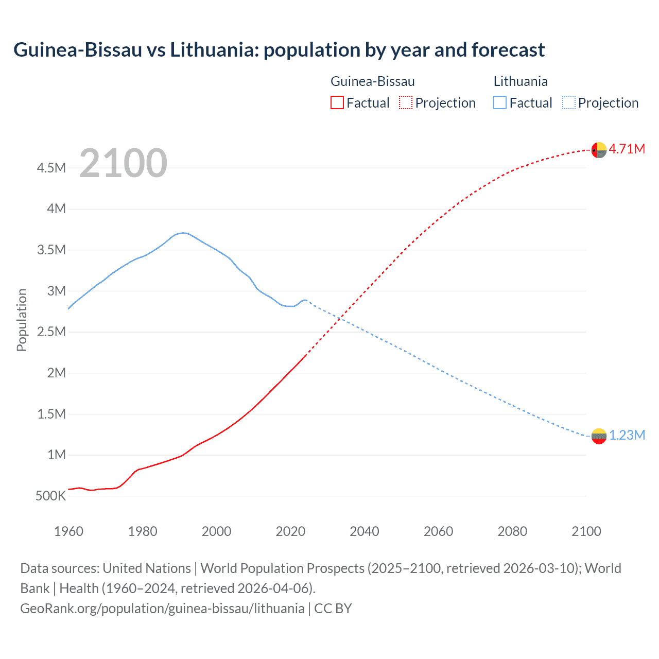 Guinea-Bissau vs Lithuania: population by year and forecast
