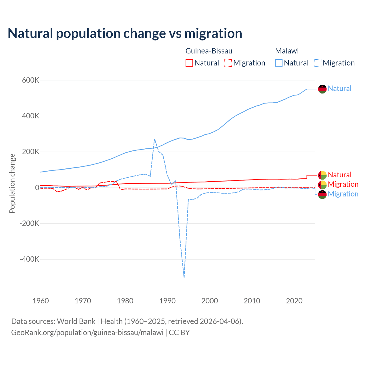 Over the last 10 years, 97.1% of the population change in Guinea-Bissau is from natural causes (a gain of 472,826 people) and 2.87% is from migration (a loss of 13,956 people). In Malawi 99.3% is from natural causes (a gain of 5,019,393 people) and 0.67% is from migration (a loss of 33,768 people).