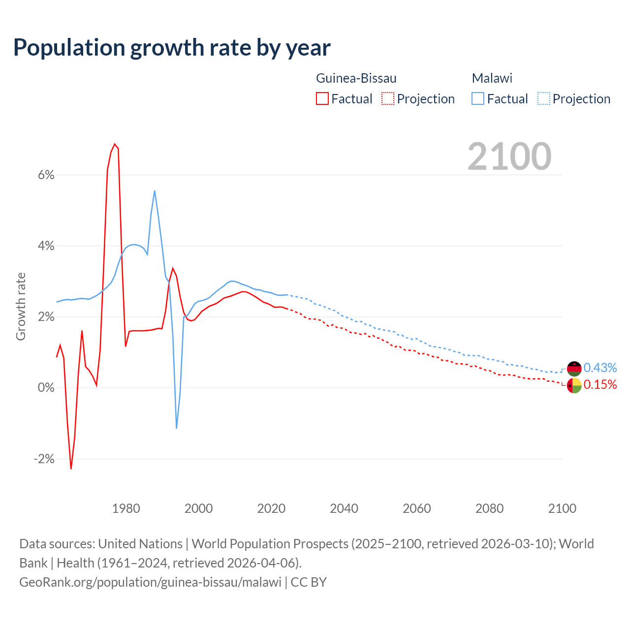 - For the last 10 years, Guinea-Bissau has had an average growth rate of +2.4% per year vs +2.7% in Malawi.