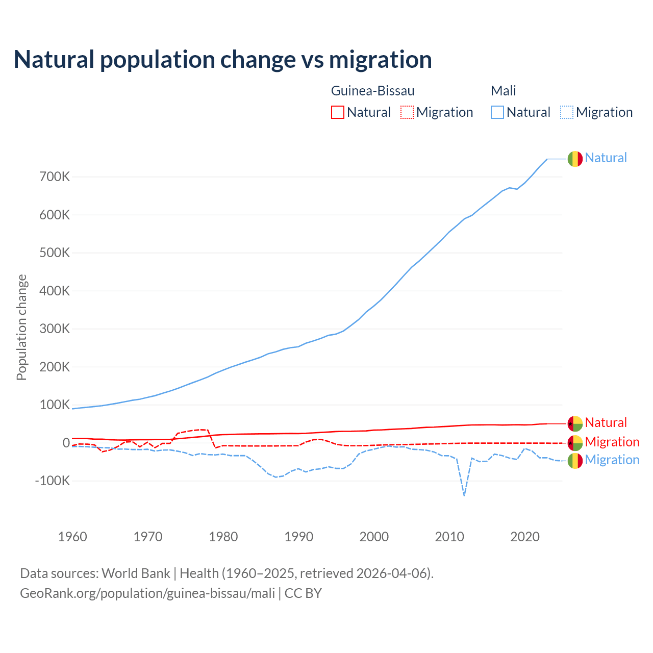 Over the last 10 years, 97.1% of the population change in Guinea-Bissau is from natural causes (a gain of 472,826 people) and 2.87% is from migration (a loss of 13,956 people). In Mali 94.9% is from natural causes (a gain of 6,749,473 people) and 5.13% is from migration (a loss of 365,292 people).