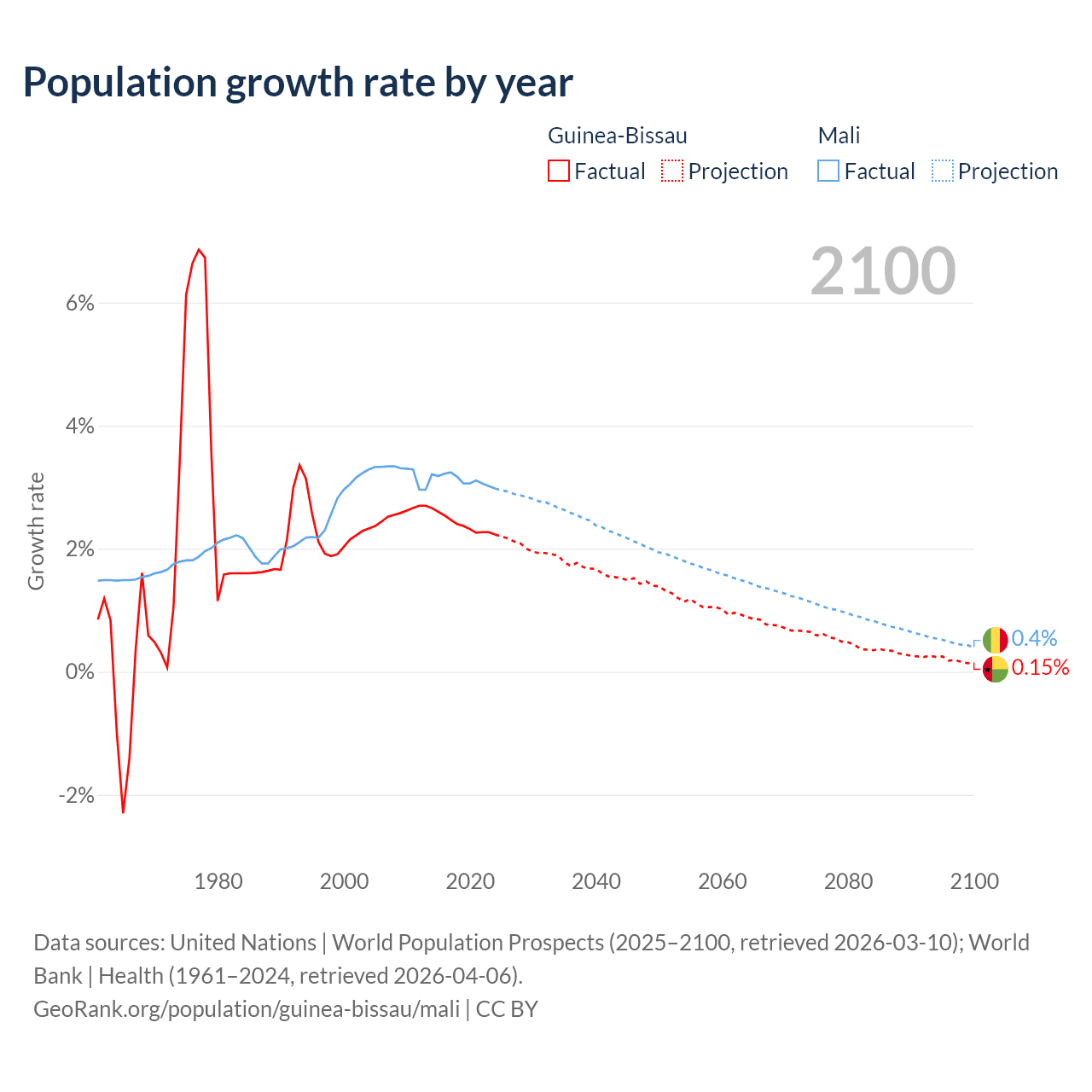 - For the last 10 years, Guinea-Bissau has had an average growth rate of +2.4% per year vs +3.12% in Mali.