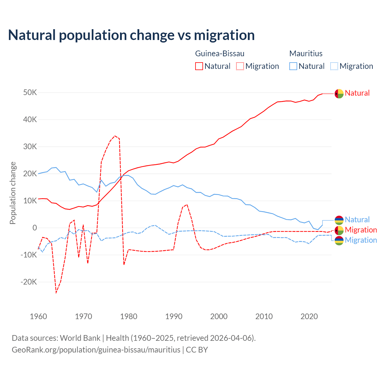 Over the last 10 years, 97.1% of the population change in Guinea-Bissau is from natural causes (a gain of 472,826 people) and 2.87% is from migration (a loss of 13,956 people). In Mauritius 30.9% is from natural causes (a gain of 19,327 people) and 69.1% is from migration (a loss of 43,294 people).
