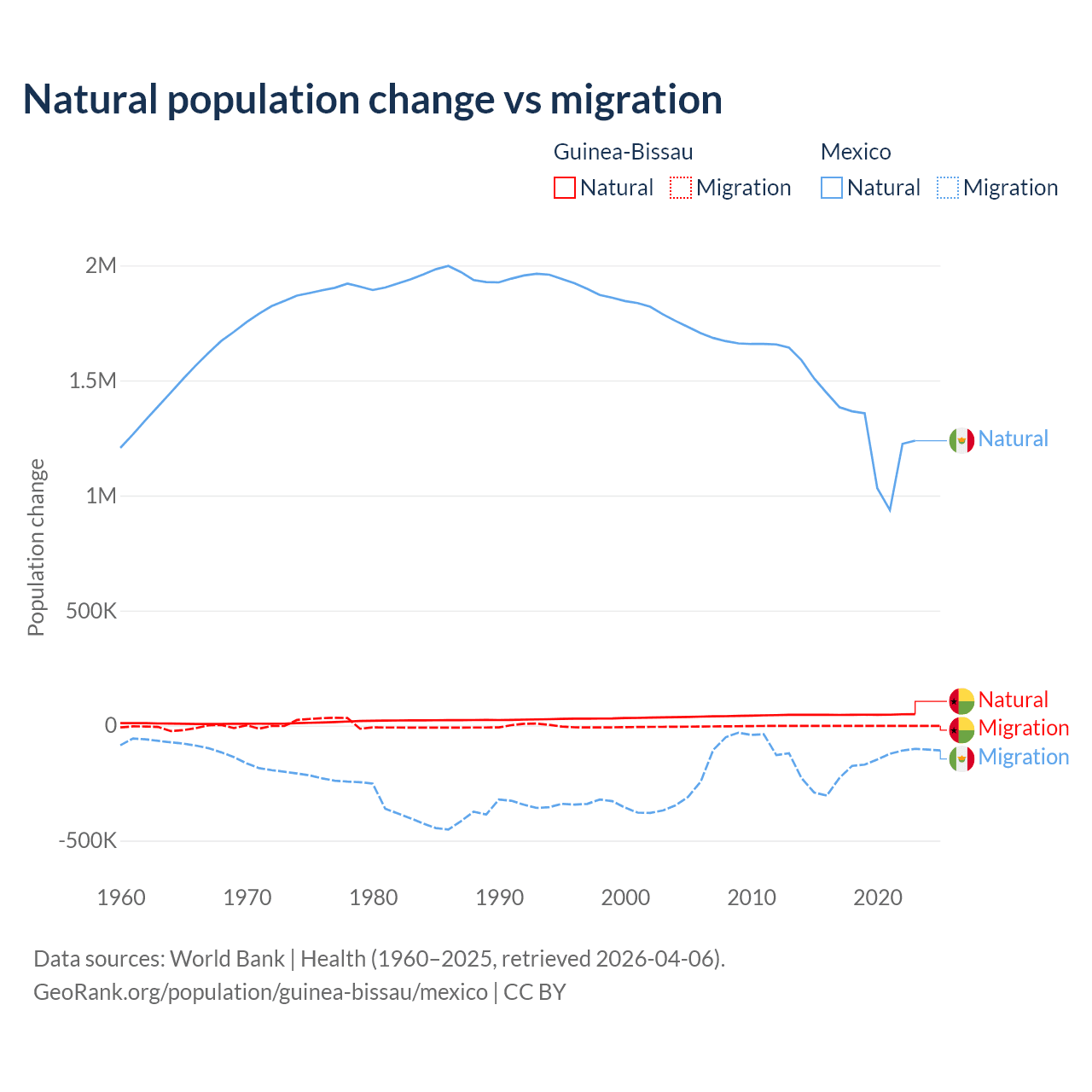 Over the last 10 years, 97.1% of the population change in Guinea-Bissau is from natural causes (a gain of 472,826 people) and 2.87% is from migration (a loss of 13,956 people). In Mexico 87.5% is from natural causes (a gain of 13,080,136 people) and 12.5% is from migration (a loss of 1,876,544 people).