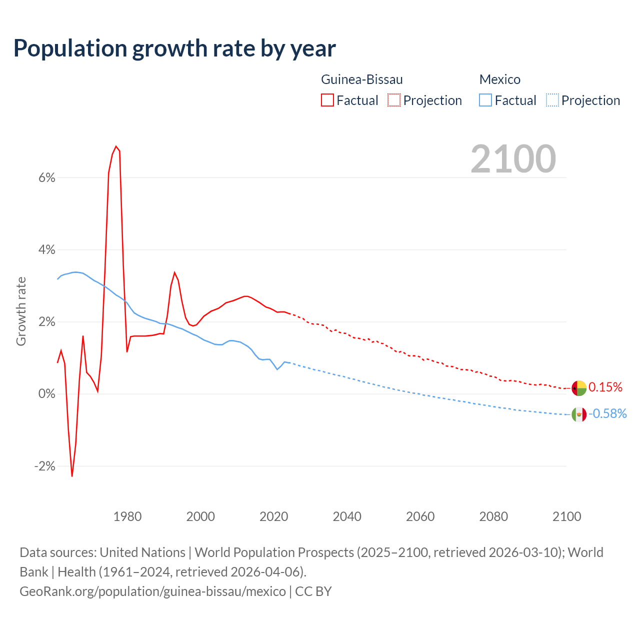 - For the last 10 years, Guinea-Bissau has had an average growth rate of +2.4% per year vs +0.92% in Mexico.